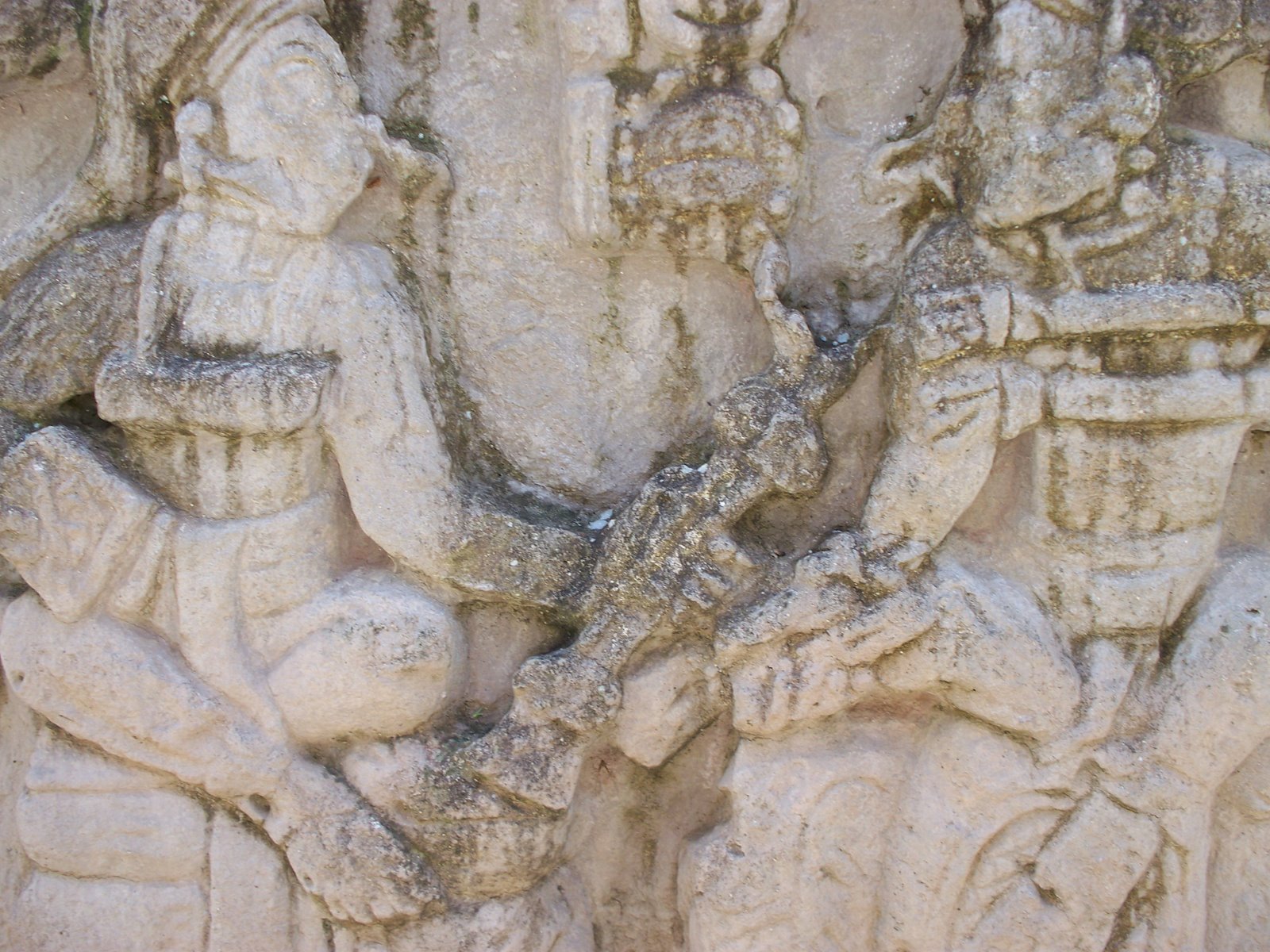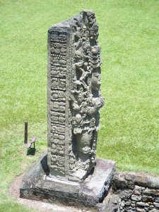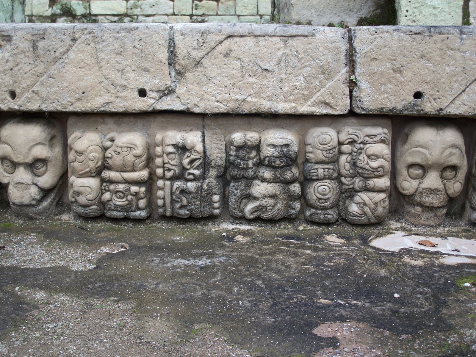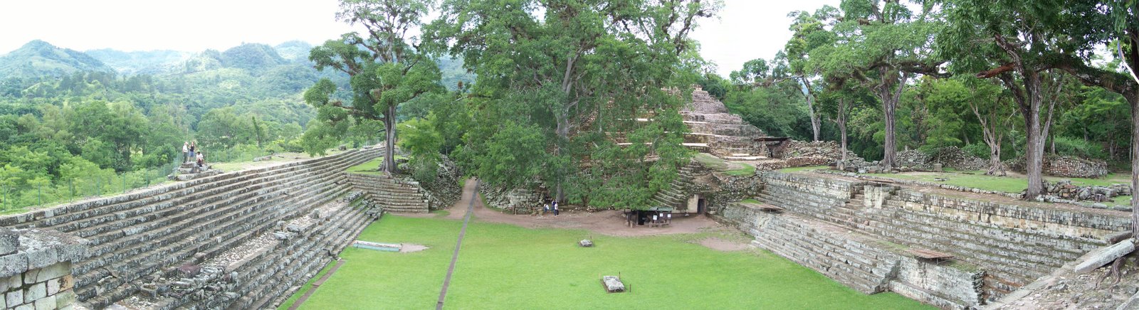 A panoramic view of one of the courtyards. At the time when the Mayas ruled, the Copan temples looked very different than they do now. The stone of the temples was painted red, in some areas you can still see a faint residue. Instead of the grassy courtyard areas, the space in between the temples was made of stone that was painted white with stucco. So rather than gray and green the entire scene would have been white and red.