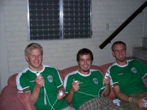 The boys playing Wii in their matching Marathon shirts.