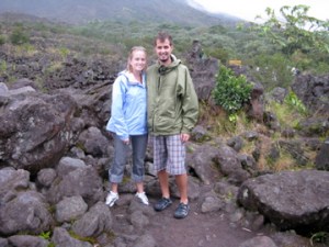 Alex and I on some volcanic rocks…waiting for it to stop raining so we can see some lava! We took this guided tour up to the foot of the volcano. There are all sorts of signs warning not to go further than this point in case of falling lava rocks.