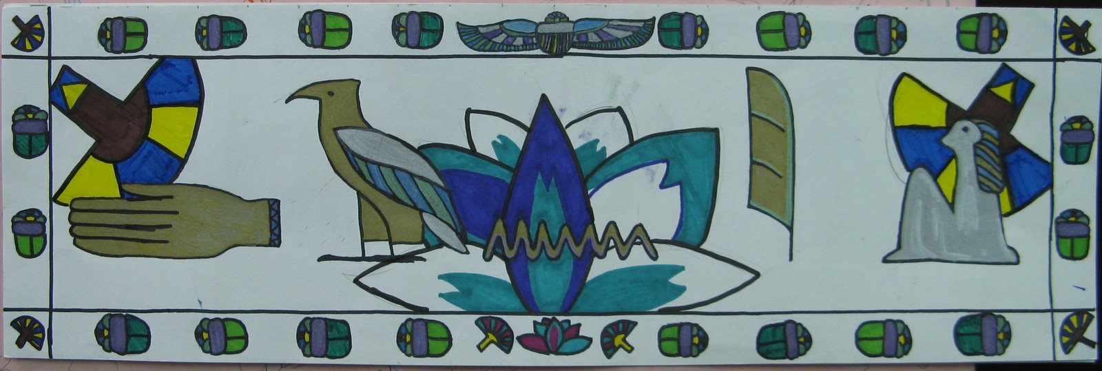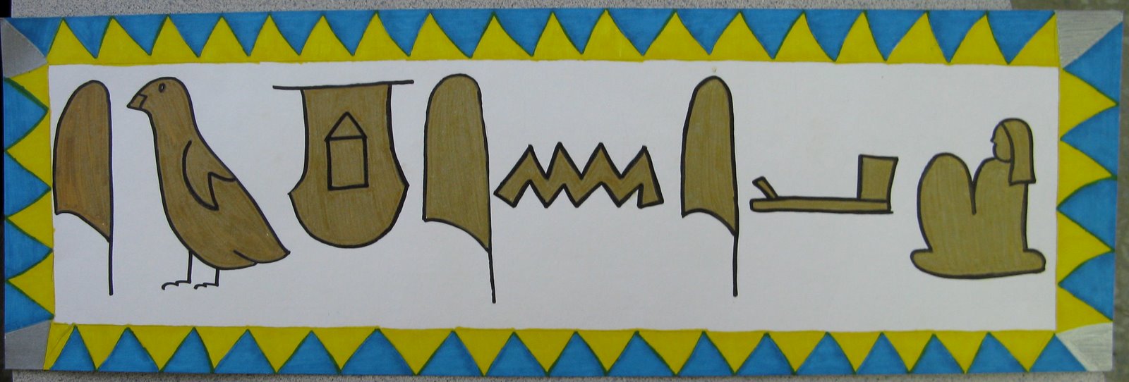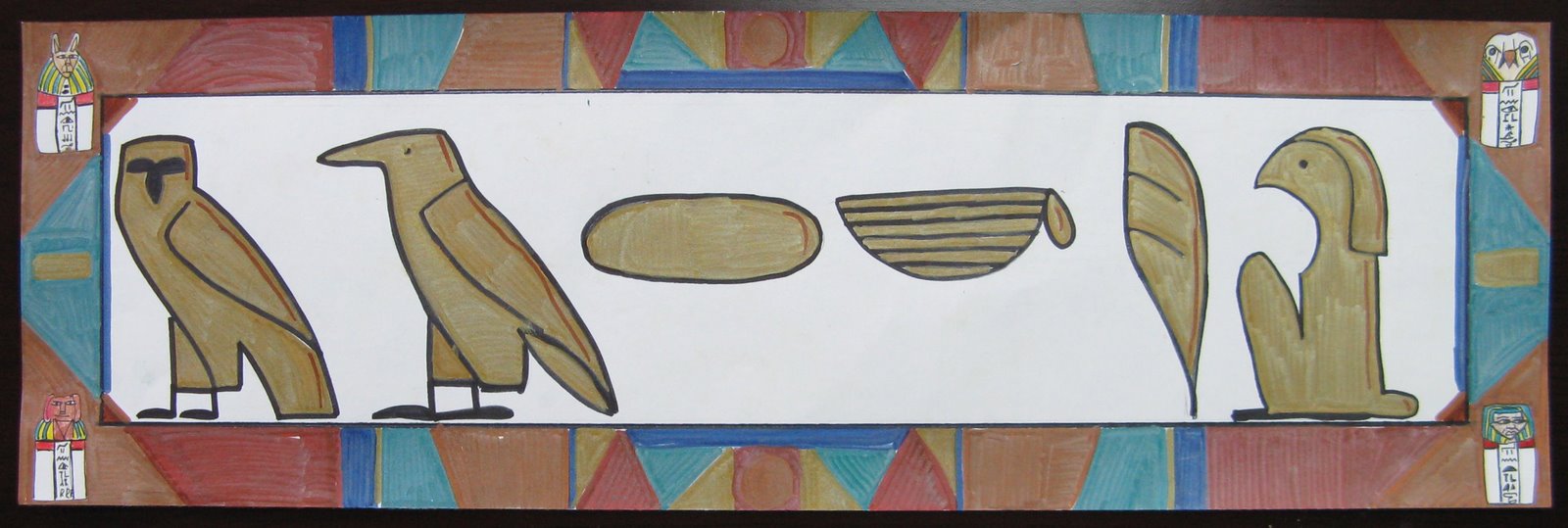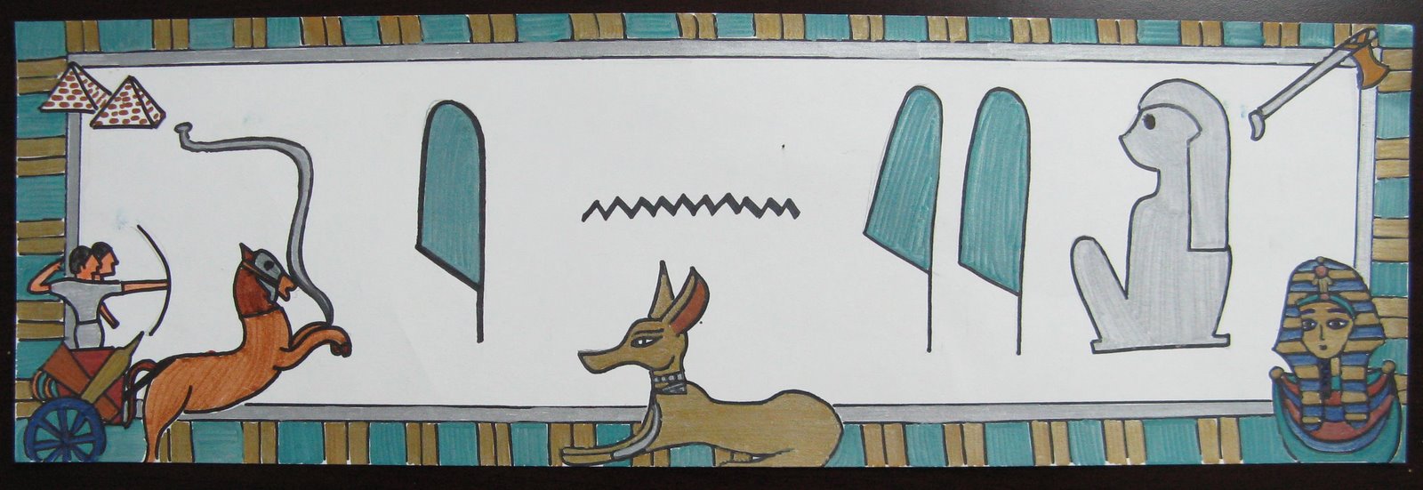 Hieroglyphics May 4, 2008June 5, 2014 • Caitlin Eighth graders created these Egyptian nameplates. Anything for an excuse to use metallic markers! In case you’re curious what they say…hieroglypics. Share this: Click to share on Facebook (Opens in new window) Facebook Click to share on Pinterest (Opens in new window) Pinterest Click to share on X (Opens in new window) X Click to email a link to a friend (Opens in new window) Email Like Loading... Related