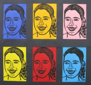 Eighth graders created self-portraits in the style of Andy Warhol. They learned about the Pop artist and his obsession with famous people and then made themselves look famous too (kind of perfect for the ego of an eighth grader if you ask me!) They also learned about different types of printmaking and used their knowledge to create a linoleum block of themselves. We started with a photo (no need to overdo it by making drawing people part of the assignment too…), transferred the photo onto the linoleum, carved away the “not lines” and printed lots and lots of copies!