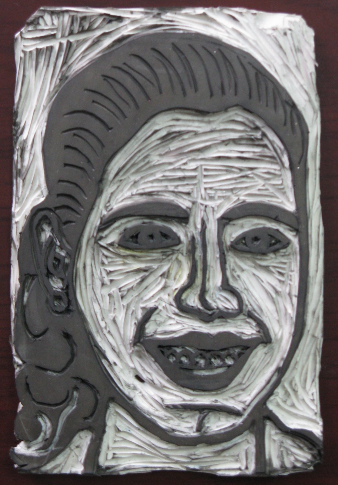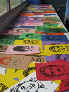 Alexandra’s linoleum after she finished carving and printing. I ordered special easy cut linoleum so that the students would be more successful and less likely to cut themselves. They used linoleum carving tools and exacto knives and I only had 2 or 3 kids cut themselves!