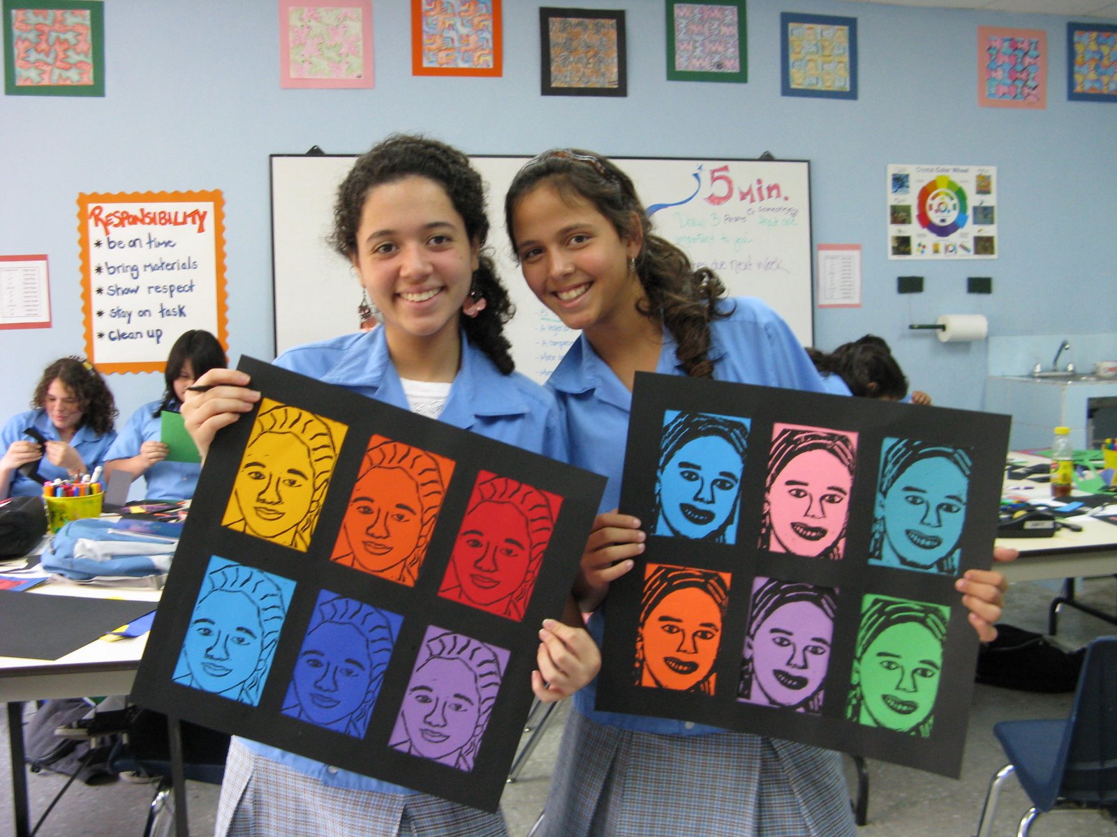 Eighth graders created self-portraits in the style of Andy Warhol. They learned about the Pop artist and his obsession with famous people and then made themselves look famous too (kind of perfect for the ego of an eighth grader if you ask me!) They also learned about different types of printmaking and used their knowledge to create a linoleum block of themselves. We started with a photo (no need to overdo it by making drawing people part of the assignment too…), transferred the photo onto the linoleum, carved away the “not lines” and printed lots and lots of copies!