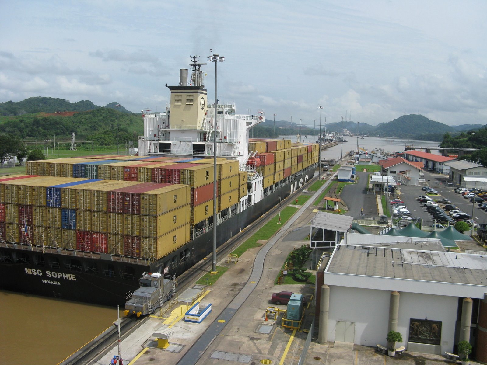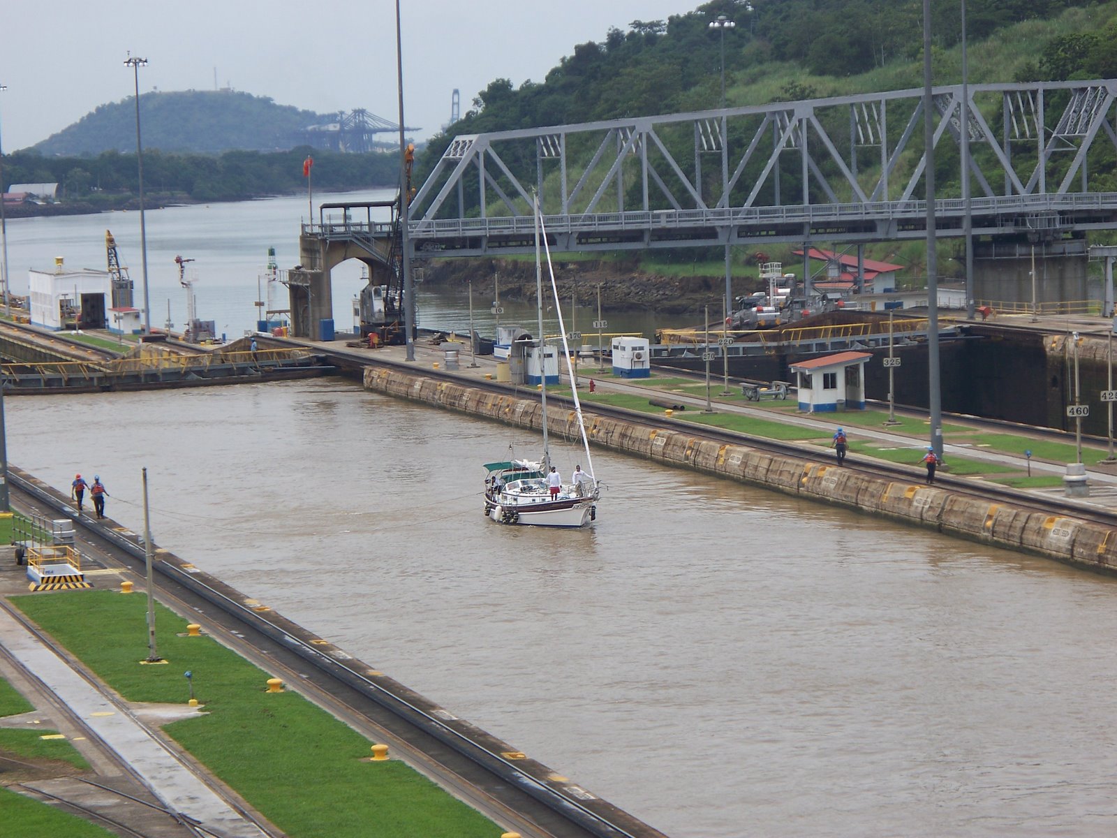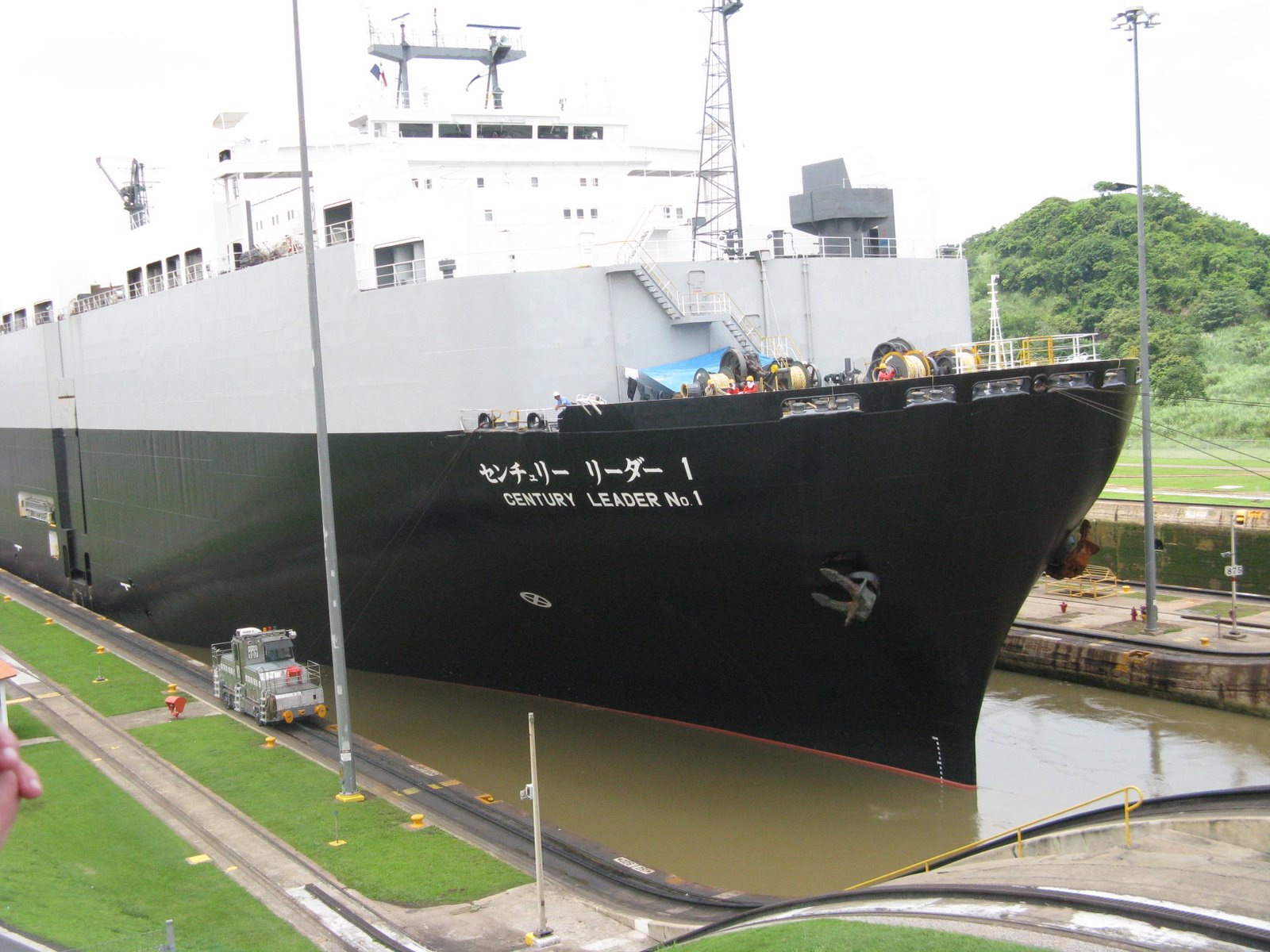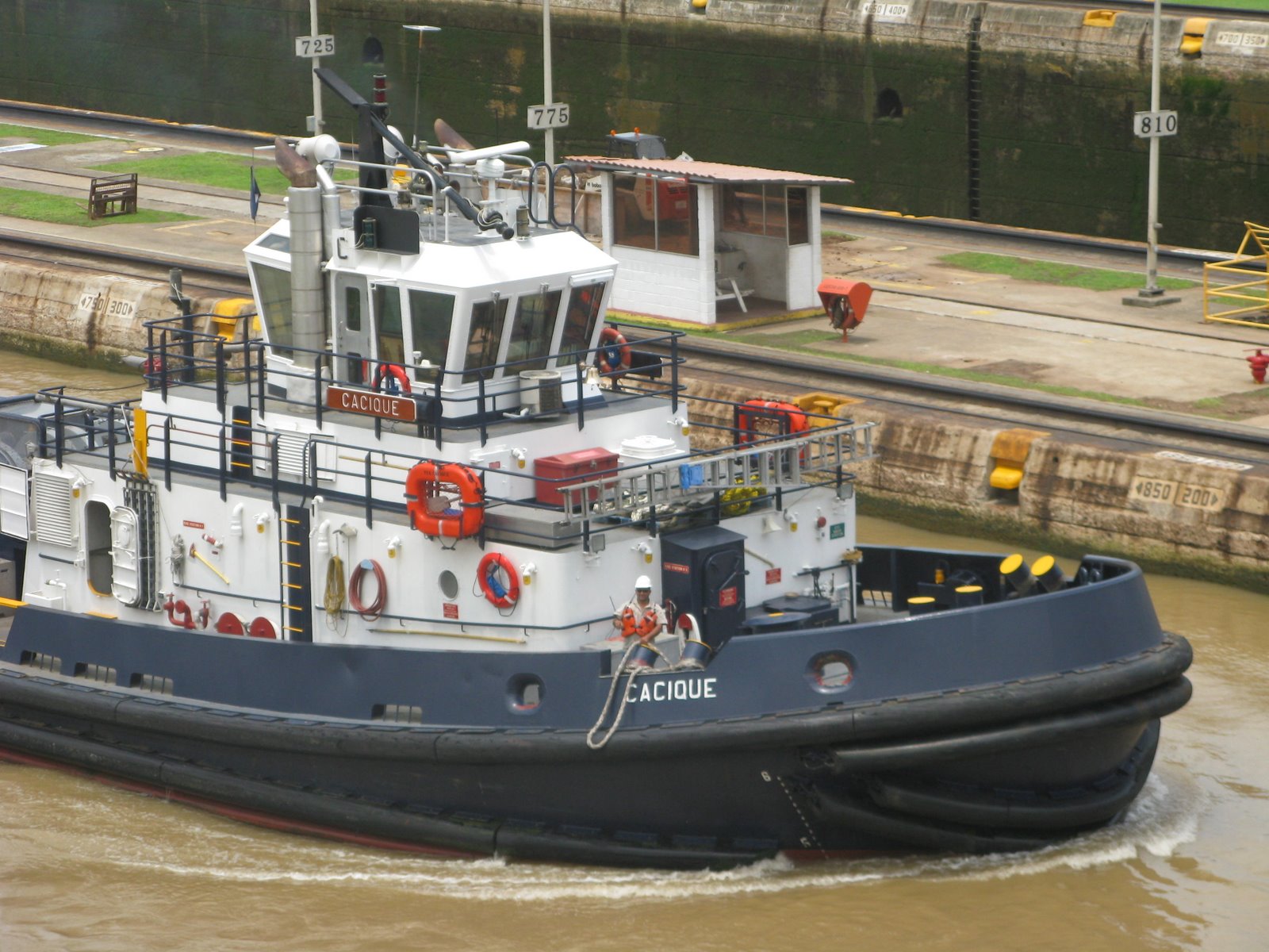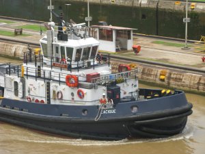 Tugboats go through the locks along with the big boats. The ships use their own motors within the Canal, but the tugboats help guide them into each lock.
