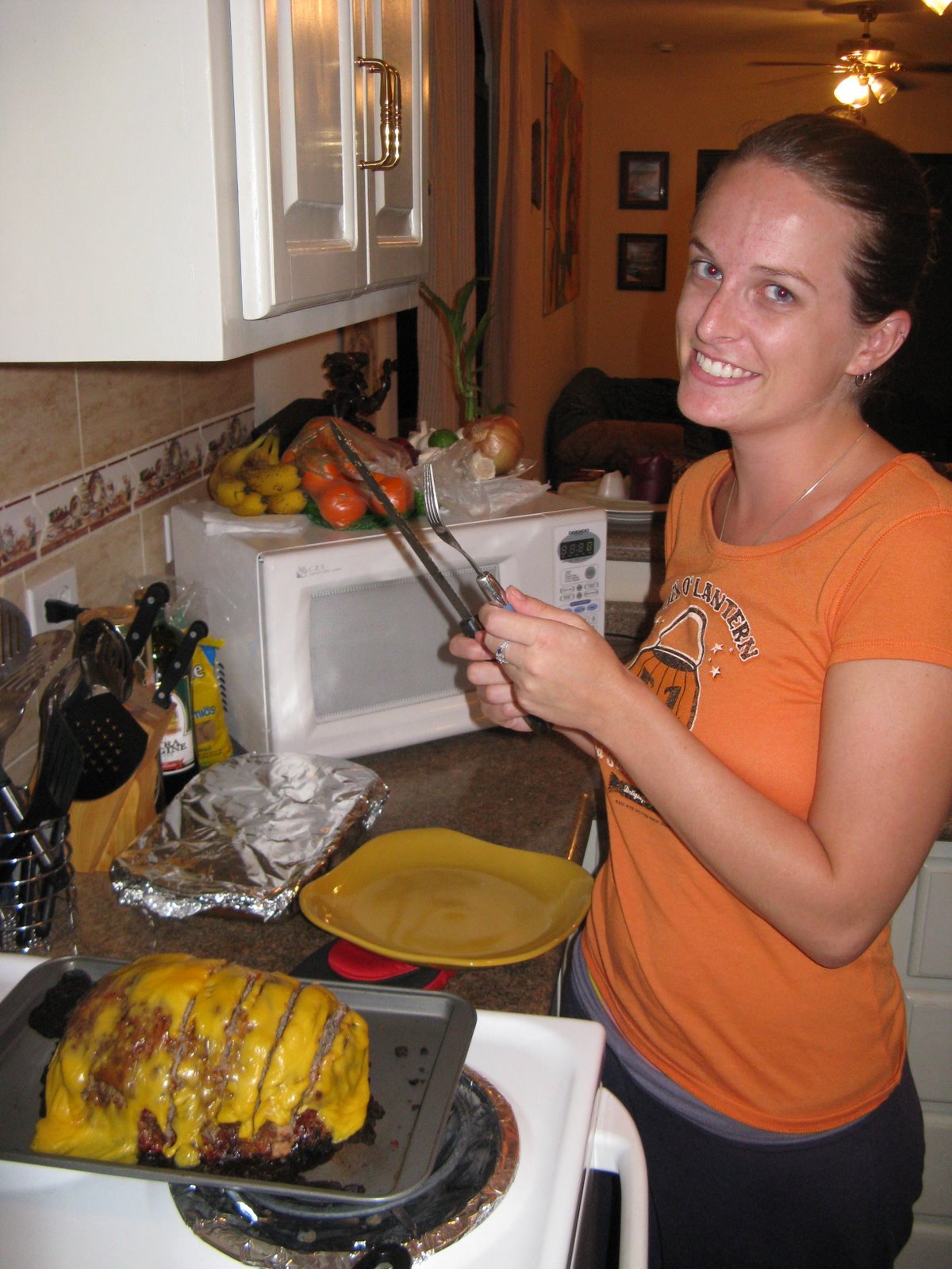 Last week Caitlin made meat loaf for dinner. She looked up online a recipe for an nontraditional meat loaf. This one had a cornbread, pepper and bacon center and it was topped with cheese. What she did not realize when making it was how big the meat loaf was going to be. So I decided to include some pictures to give everyone an idea of the size it was. This also will explain if I have been looking a little bit fatter as this thing was a beast and quite tasty.