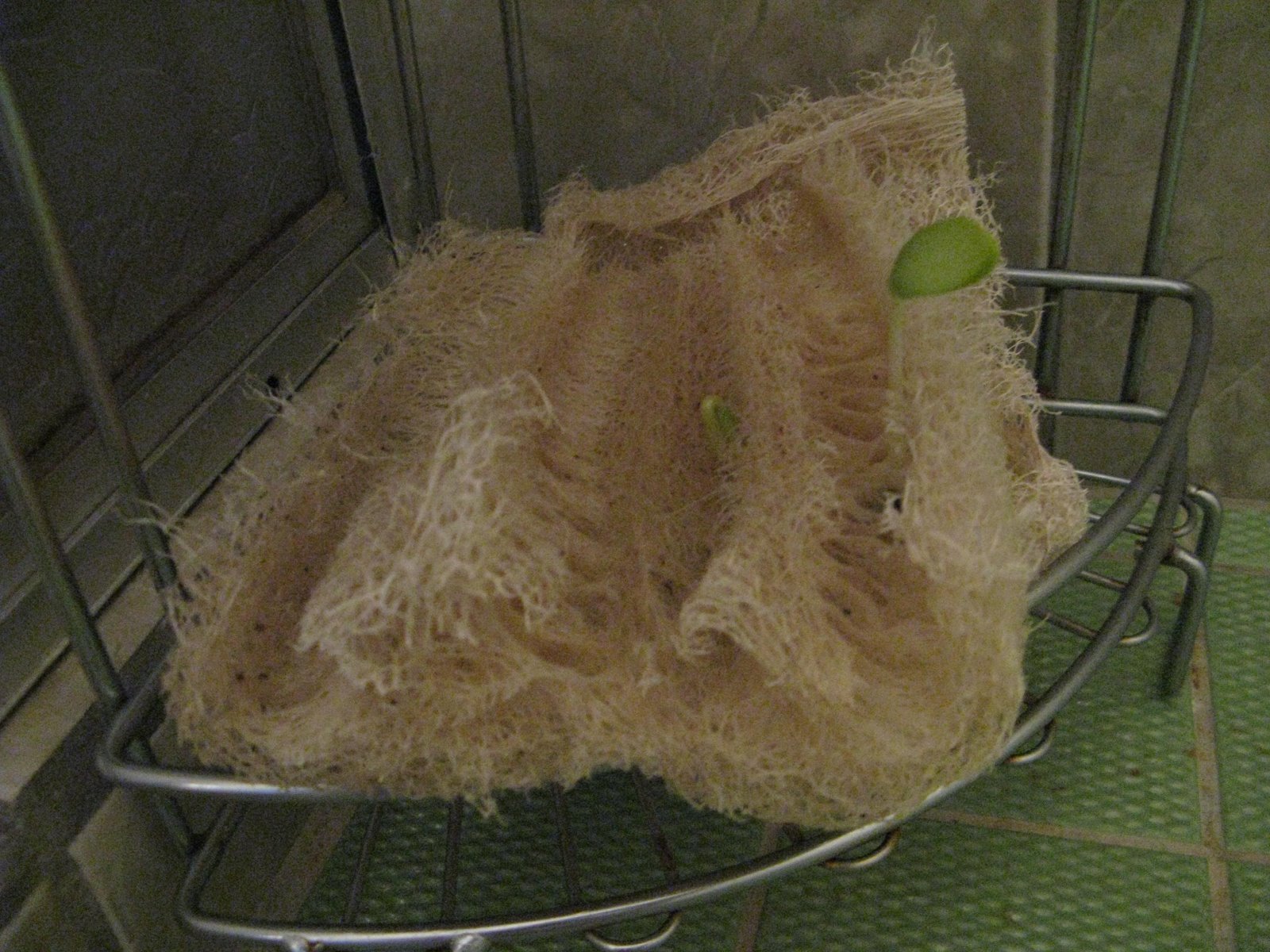 A few weeks ago, Alex bought me a natural loofah from the market, banged “all” the seeds out and cut it up into usable pieces. This week I noticed that one of the pieces I left in the shower is sprouting a mini-loofah plant! How long until I can start harvesting my own loofahs?