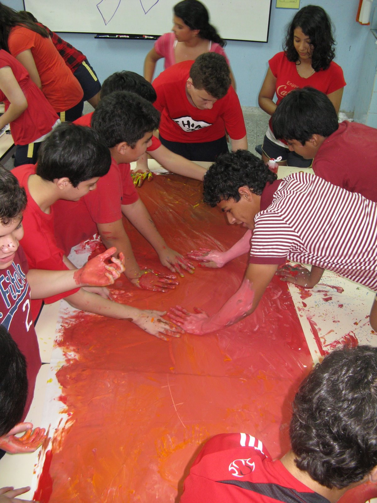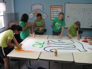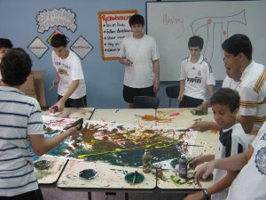 3. The assignment was for each class to split into 2 groups and create a Pi themed door decoration. They were given large butcher paper with the Pi symbol already drawn on it. I let them choose their own groups and they only had 10 minutes to do the whole thing! Almost every class just naturally split into boys and girls.As you can see from the pics the boys tended toward the let’s throw paint at the paper and make a huge mess approach while the girls in general were more concious of staying inside the lines and being neat.It was really interesting to watch how consistent the difference between the boys and girls was from class to class!
