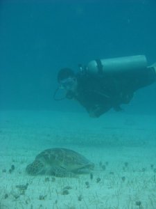 David and a tortuga!The guys actually got me to go diving. I took a refresher course so that I would feel more comfortable (my original certification course was a little lacking to say the least). I realized that I still don’t like diving, but I was glad to have tried again so that this time I know for sure. I get a little panicky about breathing down there and never really feel quite right. Despite that, I’m still glad that I’m certified so that if we are ever someplace really really cool (like the Galapagos) I could still go if I wanted.