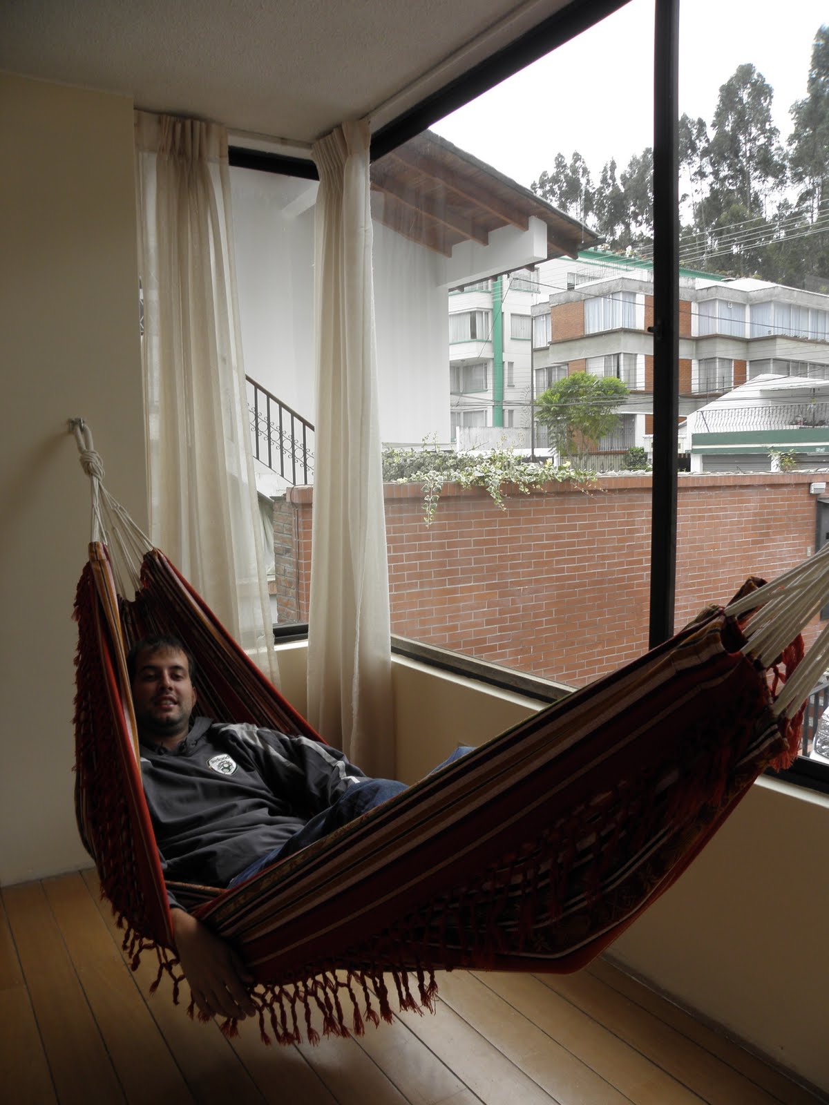 We may be moved in to our new apartment, but we are still waiting on furniture. It has all been purchased, but not delivered yet. So in the meantime we bought a hammock for $16 at the market! I’m not sure it will work well as a dining chair replacement, but it looks perfect for reading a book or napping!! We already had hooks in the wall so this little nook is now officially our hammock room.