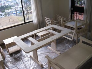 In an attempt to save money we purchased most of our furniture “raw” aka only sanded. The store wanted $500 more to stain and lacquer everything so we figured we could do that ourselves. We’ll see if we still think that after going through the process. So far we have gotten through the primer stage and are working toward the stain, sealant, sanding, sealant, lacquer, sanding, and lacquer stages. Our goal is to finish everything by next weekend…..but you should know that we aren’t just talking one or two pieces of furniture. Nope, there was an oferta so we went all out and got: a bed frame, two nightstands with drawers, a dining room table, six dining chairs, two IKEA style chairs, an IKEA style couch and a coffee table.
