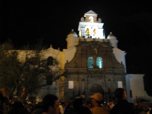 After enjoying the view for a bit we began to make our way down the rest of the hill, stopping at one apartment at a time to chat and enjoy a beer. Several of our coworkers like in Guapulo. We were specifically told not to live there this year since the area is sometimes known for mudslides during the rainy season and with only one way in and out….We finally made it to the bottom of the hill and joined the crowd gathered in front of the church.