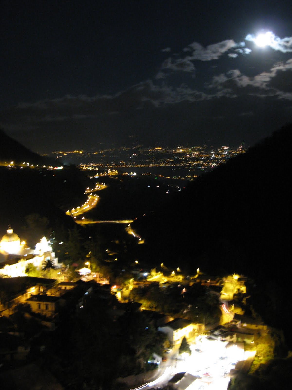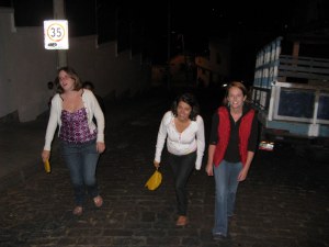 Last Saturday, after our adventures in Old Town, we headed for a different part of the city, Guapulo. There is an annual Fiesta de Guapulo that happened to be last weekend! The tradition involves fireworks, music and moonshine. Guapulo itself is in a valley on the edge of Quito. There is one very windy and steep cobblestone road that leads down to the church in the central plaza. We began our night by stopping at a restaurant halfway down the hill to meet up with friends from school. The view from the restaurant was impressive: