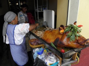 This past saturday Caitlin and I went to Otavalo a nearby town that is known for its artisan market, which is one of the biggest in South America. One of the other teachers had arranged to rent a bus, so about 30 teachers went. Caitlin will be posting on this later, this post is on a meal in a bag. As we had been shopping all day and shopping is tiring stuff as you well know I decided I needed something to eat before heading to the leather market. So as we were walking I noticed a restaurant with a pig head sticking out. I had noticed multiple carts with the same type of presentation but had not been hungry. Now for what ever reason this pig head peaked my hunger. It seemed like I had found lunch, but then came the info that has been placed so concretely in my brain by my abuela “No comes en la calle” but on my other shoulder was Anthony Bordain saying “How can you experience a culture without trying the street meat.” Not only was this a dilemma about food but I knew we had a 2hr bus ride home, so if this lunch didn’t go well it could be really embarrassing and awkward. Needless to say I decided to give it a shot after seeing some relatively healthy looking people order lunch. The result, I was healthy and it was a delicious lunch for 1.50. It was like a dry Pozole. The woman put homile corn, mashed fried potatoes, pork, a chunk of chicharron, some pork drippings, onion and a little salt(I opted out of the lettuce, I’m not that whimsical, I did learn something).