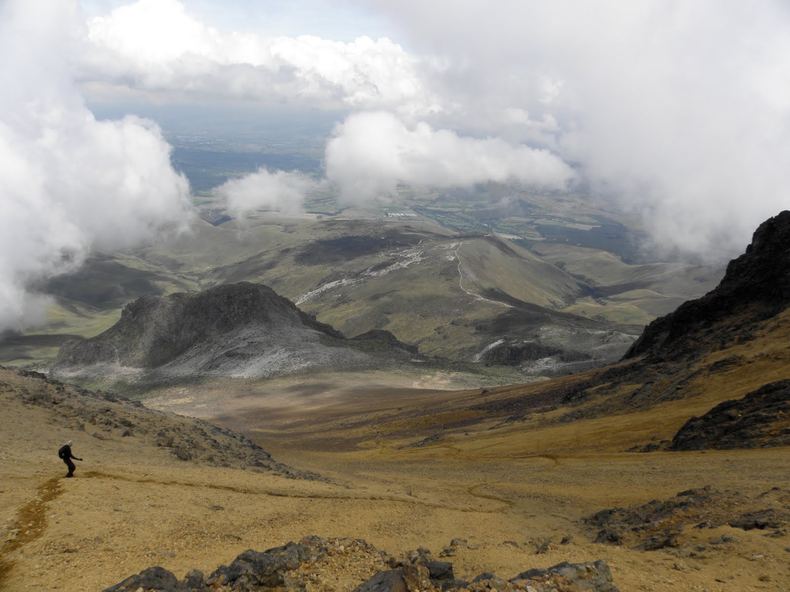 The latter half of the summit trail was a direct route up the eastern spine filled with sections of loose sulfur rich gravel/scree, and rock scrambles with up to 6′ fairly vertical walls to crawl up. This trail lead around false peaks and steep drop offs. Most of this section we were blessed with decently clear skies, once and a while we were given a glimpse of Iliniza Sur, a snow capped technical glacier climb topping off at 5,248 meters.