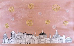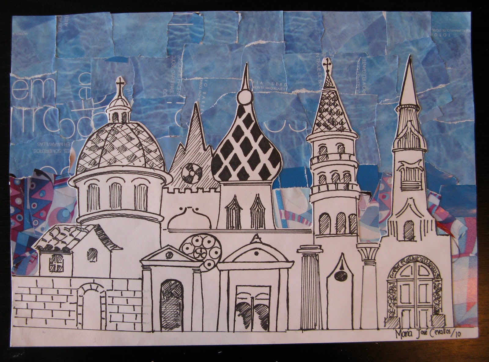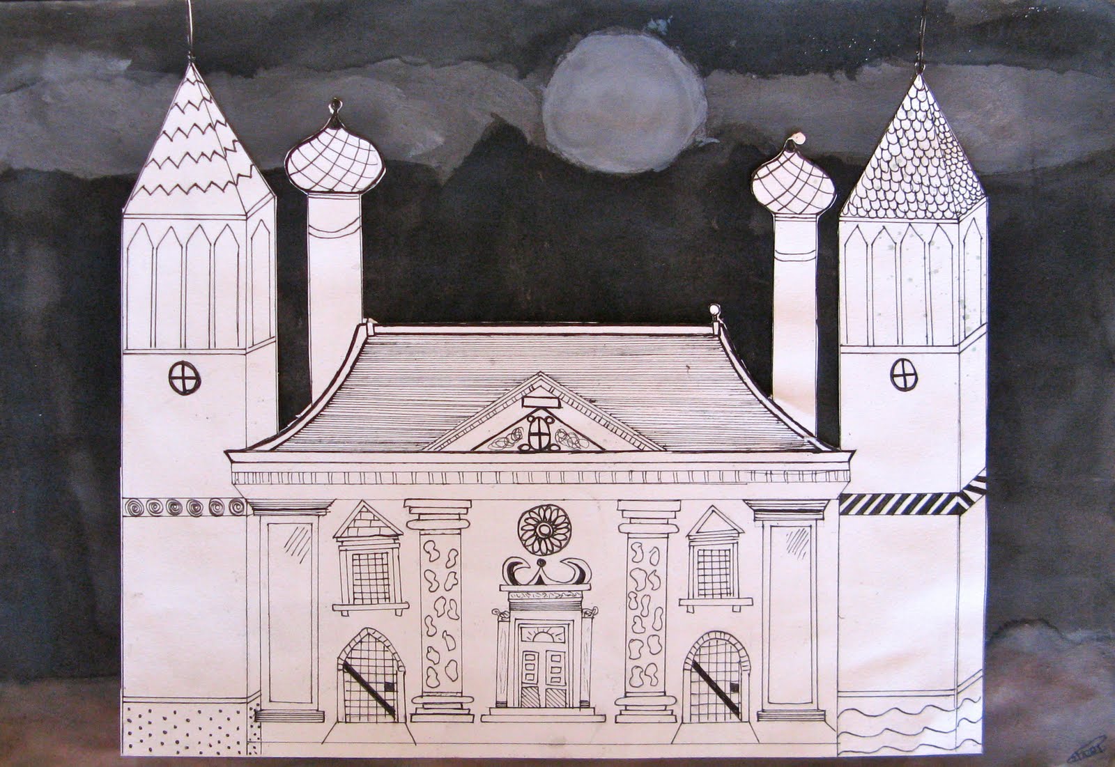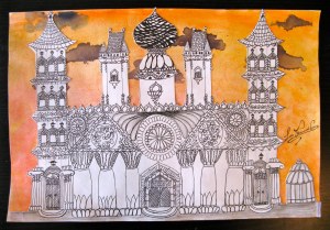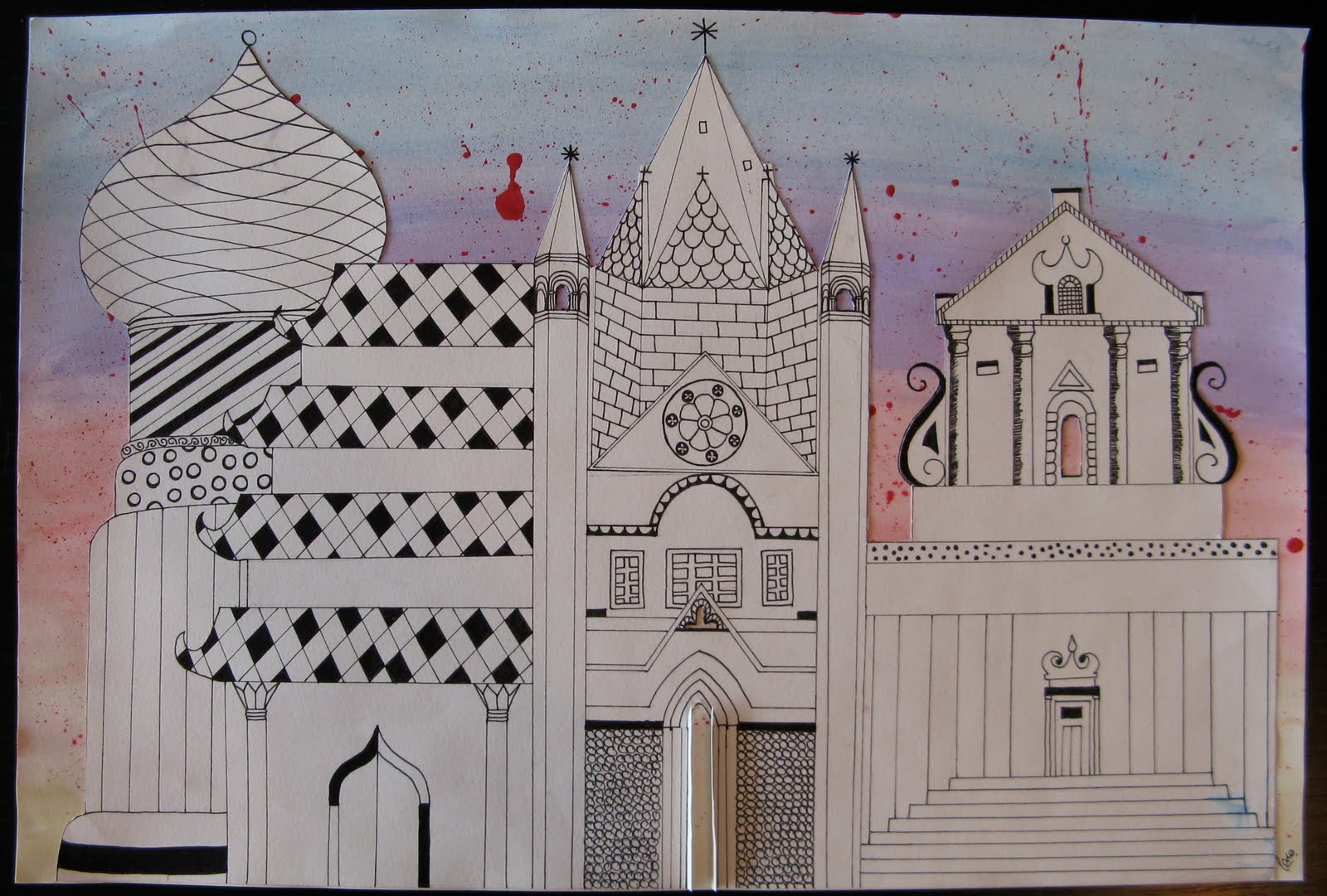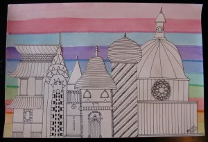 My 10th grade students have spend the last semester focused on architecture. We began by researching different styles in small groups and creating informative posters to display in the classroom. Next, students used the information from the posters to create their own unique building that incorporated information from at least five different styles of architecture. They made rough drafts, then final drafts, finished them in pen and added interesting backgrounds. The results were some interesting multi-cultural masterpieces!