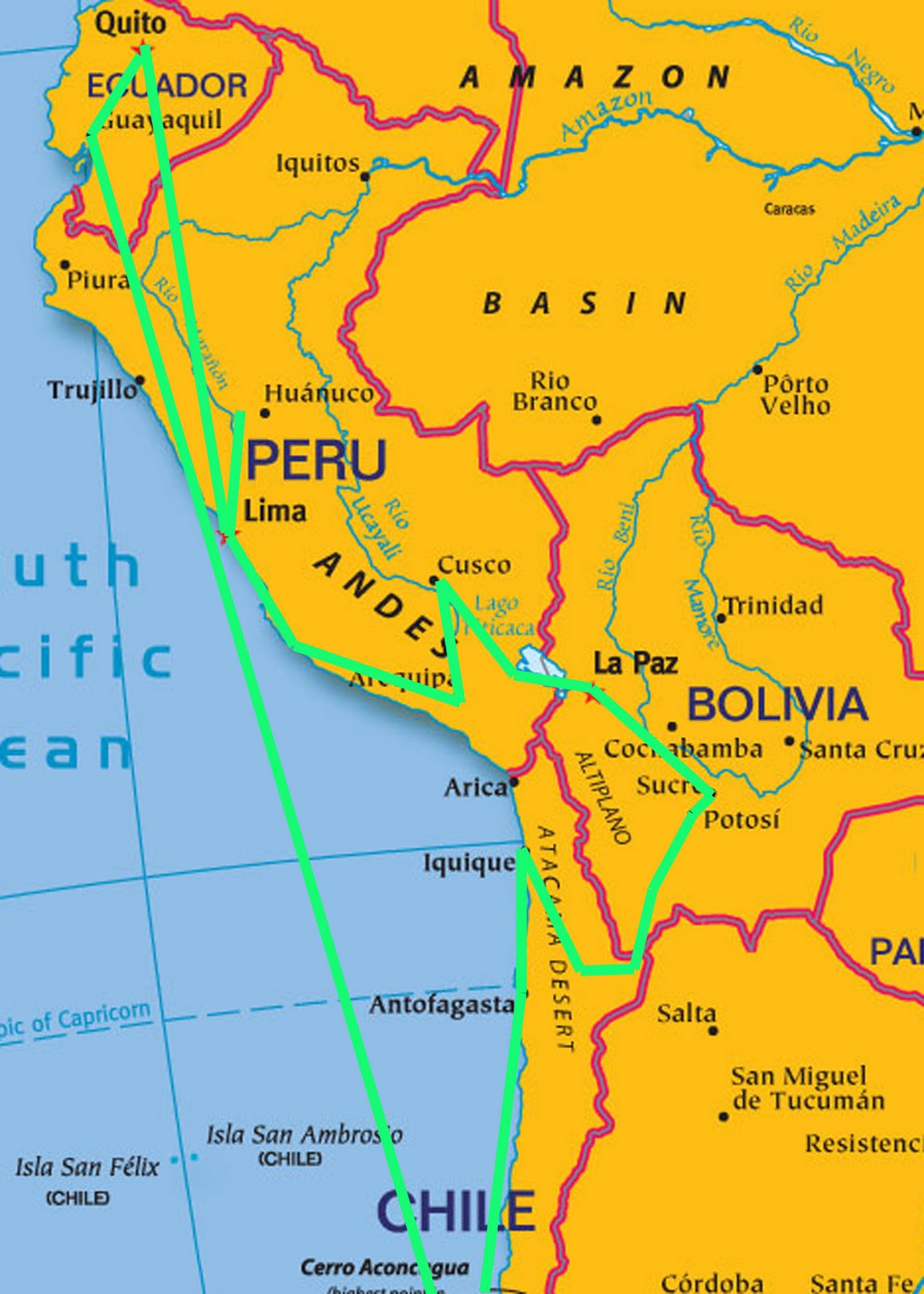 Una Mapa de Nuestro Viaje August 13, 2010June 5, 2014 • Caitlin A little map to help you visualize the next million posts we put up. Quito>Iquique>San Pedro de Atacama>Salt Flats of Uyuni>Potosi>Sucre>La Paz>Puno>Cusco>Machu Picchu>Arequipa>Nazca>Ica>Lima>Huaraz>Lima>Quito Share this: Click to share on Facebook (Opens in new window) Facebook Click to share on Pinterest (Opens in new window) Pinterest Click to share on X (Opens in new window) X Click to email a link to a friend (Opens in new window) Email Like Loading... Related