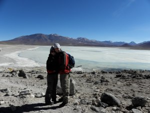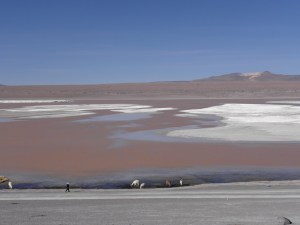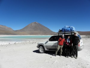 After crossing the very tight border into Bolivia we began our tour. Now I know many of you worry that we don’t travel in style. But not to worry we definitely did this tour with class. As our Lexus SUV toured us through the salt flats I couldn’t help but be reminded of the Grey Pupoun add. Unfortunately there was no traffic light or Rolls Royce. The reality is that apparently only Toyota Land Cruisers and Lexus Land Cruisers both identical are the only types of trucks that with stand the wear and tear of the terrain. Now that I have gotten that plug out of the way onto the trip. The first day of the trip consisted of driving through wind swept terrain that had little to no vegetation. There were however multiple lakes of different colors because of the high mineral content of each lake. After passing by the lakes and getting out to take pictures we came to a desert landscape call the dessert of Dali because of the weird rock formations in the middle of sand. Following the Dali dessert we got a chance to warm up in some hot springs. Unfortunately changing out of swimsuits quickly eliminated any heat we had gained. Luckily Caitlin and Amanda were taking advantage of their Alpaca purchases. After leaving the hot springs we continued our surreal safari to 4800mts above sea level to see gurgling sulfuric pools. The day came to an end at a reddish pink lake where we were lucky enough to see flamingos since they typically have migrated out of the Salt flats during this time of the year. The reason this lagoon has flamingos and is reddish pink is because of the micro organisms/algae. These little guys are what the flamingos eat and is what causes them to turn their pinkish color. I will post only one one picture of the flamingos because Caitlin went nuts taking pictures of them, thus a blogpost of their own is coming to show off the 500 plus pictures she took.