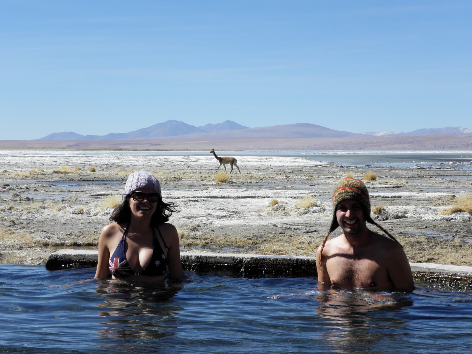 Amanda and I in the hot springs. Caitlin insisted on taking the picture with the Vicuña in the background instead of jumping in right away.
