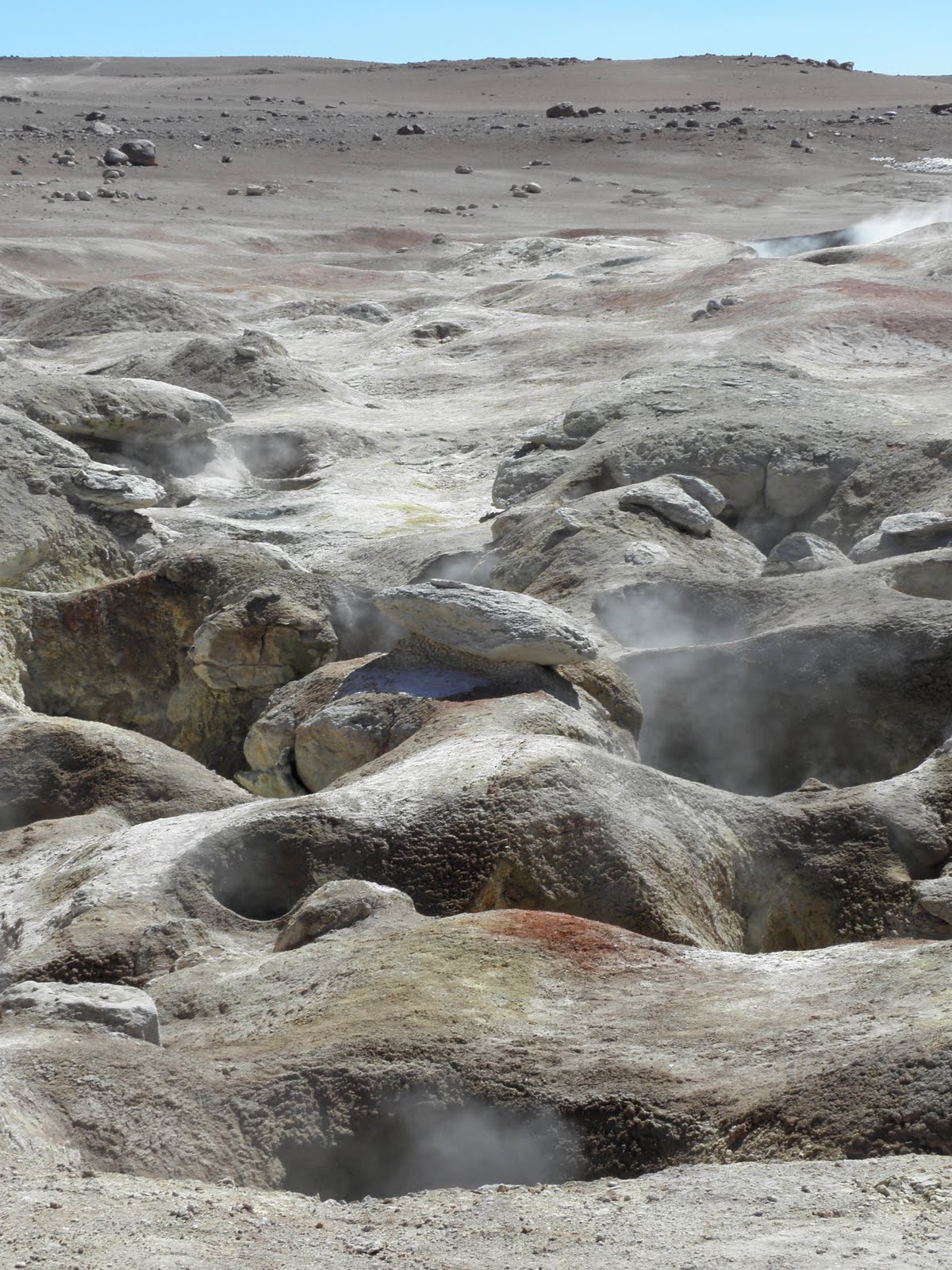 After crossing the very tight border into Bolivia we began our tour. Now I know many of you worry that we don’t travel in style. But not to worry we definitely did this tour with class. As our Lexus SUV toured us through the salt flats I couldn’t help but be reminded of the Grey Pupoun add. Unfortunately there was no traffic light or Rolls Royce. The reality is that apparently only Toyota Land Cruisers and Lexus Land Cruisers both identical are the only types of trucks that with stand the wear and tear of the terrain. Now that I have gotten that plug out of the way onto the trip. The first day of the trip consisted of driving through wind swept terrain that had little to no vegetation. There were however multiple lakes of different colors because of the high mineral content of each lake. After passing by the lakes and getting out to take pictures we came to a desert landscape call the dessert of Dali because of the weird rock formations in the middle of sand. Following the Dali dessert we got a chance to warm up in some hot springs. Unfortunately changing out of swimsuits quickly eliminated any heat we had gained. Luckily Caitlin and Amanda were taking advantage of their Alpaca purchases. After leaving the hot springs we continued our surreal safari to 4800mts above sea level to see gurgling sulfuric pools. The day came to an end at a reddish pink lake where we were lucky enough to see flamingos since they typically have migrated out of the Salt flats during this time of the year. The reason this lagoon has flamingos and is reddish pink is because of the micro organisms/algae. These little guys are what the flamingos eat and is what causes them to turn their pinkish color. I will post only one one picture of the flamingos because Caitlin went nuts taking pictures of them, thus a blogpost of their own is coming to show off the 500 plus pictures she took.