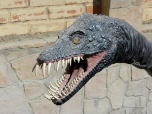As we entered the park we found many big fake dinosaur sculptures and a lookout toward the cement excavation site near the cliff across a giant hole next to the park. Everyone was lined up looking across this hole so we lined up too…and couldn’t figure out what on earth everyone was looking at! Finally, we realized that some marks on the wall are the dino prints…just that they are so far away you can barely see them and they look tiny from so far away. To top off the weirdness of this set-up, several large trucks were busy excavating cement material from the bottom of the cliff where the dino prints were.
