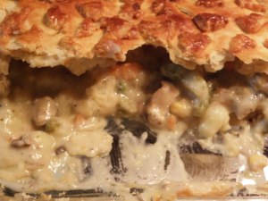 So tonight I used some of that precious condensed soup, added mushrooms, broccoli, potatoes, chicken, and a can of mixed veggies, then plopped it all in between two layers of flaky pie crust.