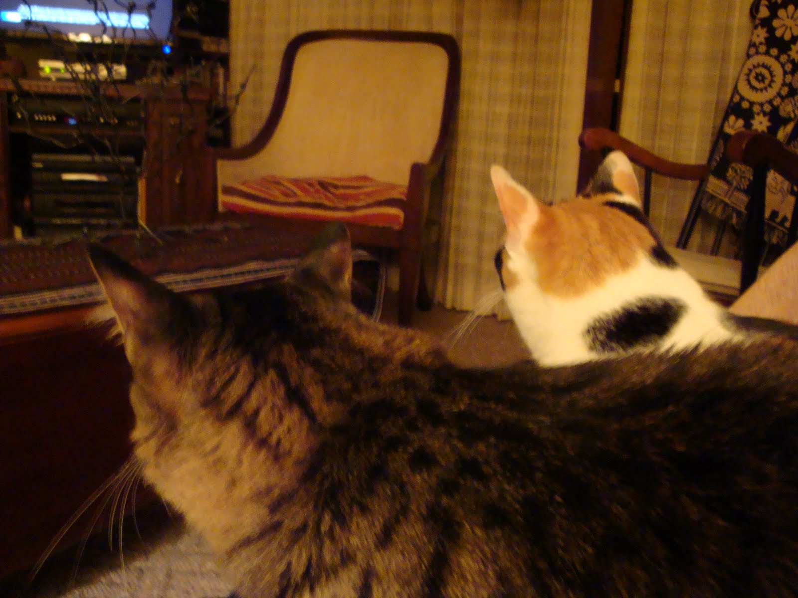 The ringing in my ears has finally stopped. I have been exploring this new world carefully. Female cat looks like Olive, but calls herself by a new name and is acting strangely. There is another such in the yard which looks like her, but only has two colors. That one is very brave. This one hides under things, and at other times she teases me and then retaliates. She tried to lure me to the top of the world, and then whacked me in the face. Have hired earthling to document torture. Note attached evidence.