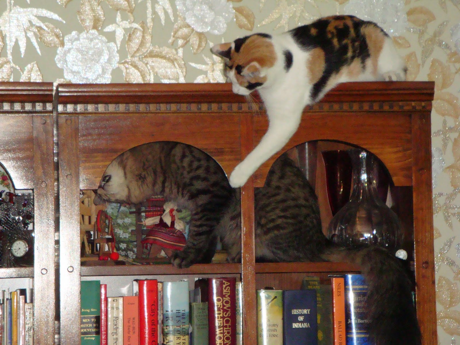 We are all adjusting to each other. I’m getting a lot of household tasks done, including cleaning the top of the bookcases and packing pottery for storage and Goodwill. The cats are sleeping a lot, but there energy level is back to normal and they’ve really made a terrific adjustment.