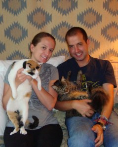 They spend the night in the living room on the alpaca blanket, arranged artfully in either the same position or mirror images on opposite ends of the sofa. They’re very affectionate, although Olive is a bit unpredictable and tends to nip. They seem to like the porch, but don’t stay out there without me. When I open the front door they both disappear completely.