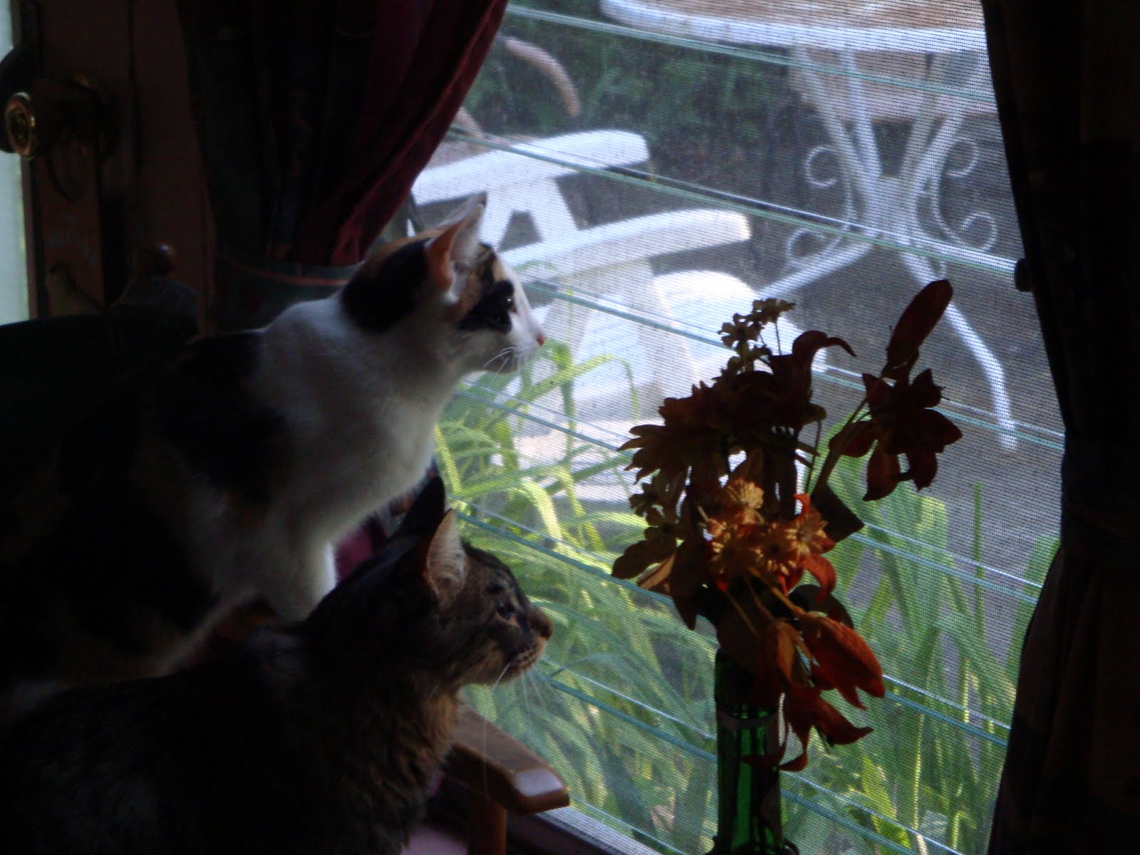 Their activities alternate between catching up on their sleep and frantic activity. So far they are more interested in the birds than in other cats, but they are occasionally interested in TV. The cats have had a rough day keeping me entertained. Olive is asleep under the alpaca throw, and Frijole is nappingbehind the couch, where he’s been since I went out to get the mail. They have a nerve- I’m the one who moved, washed, and packed all the pottery and did 8 loads of laundry. I need a glass of wine. They’re not getting any.
