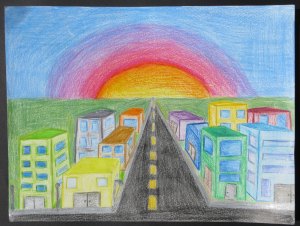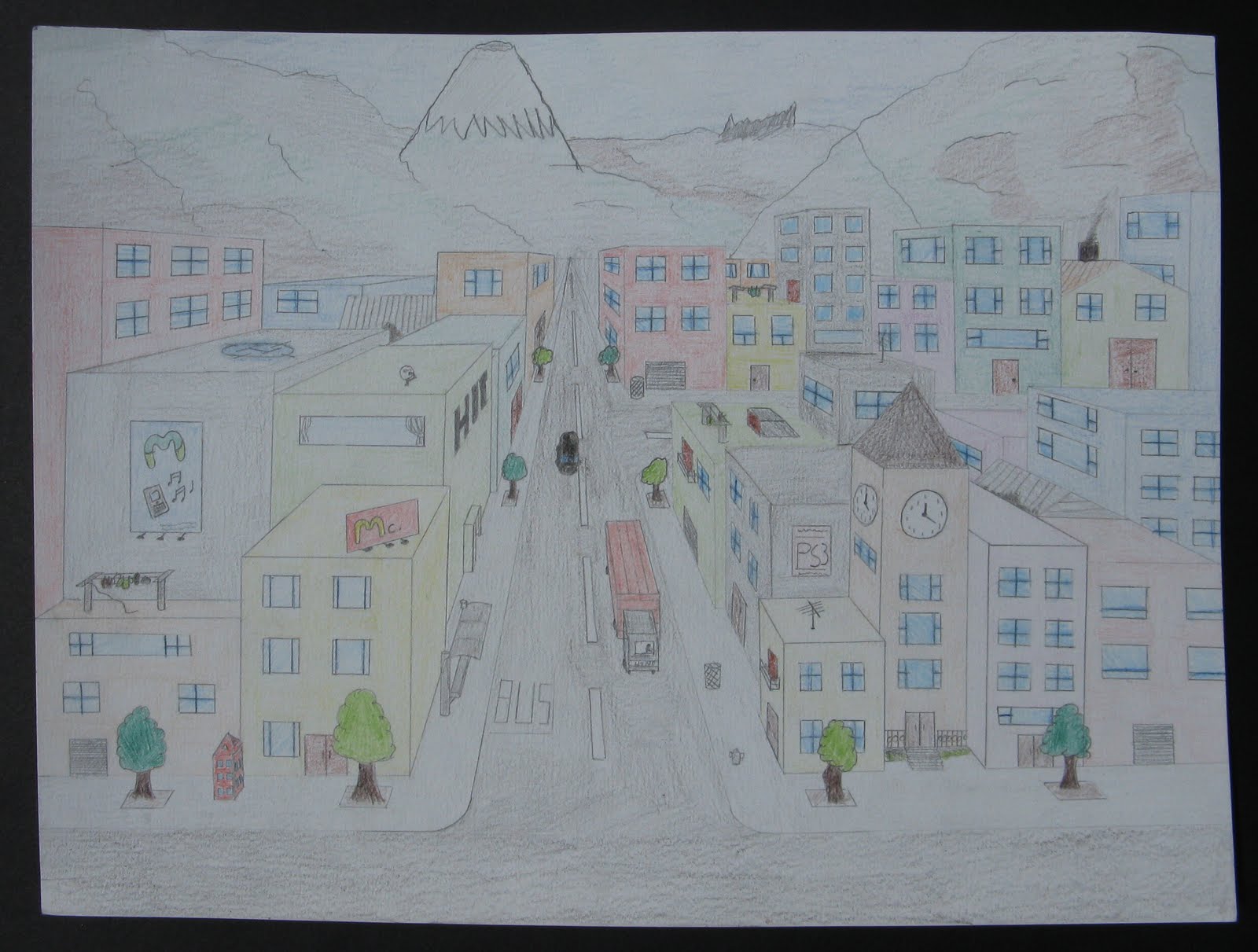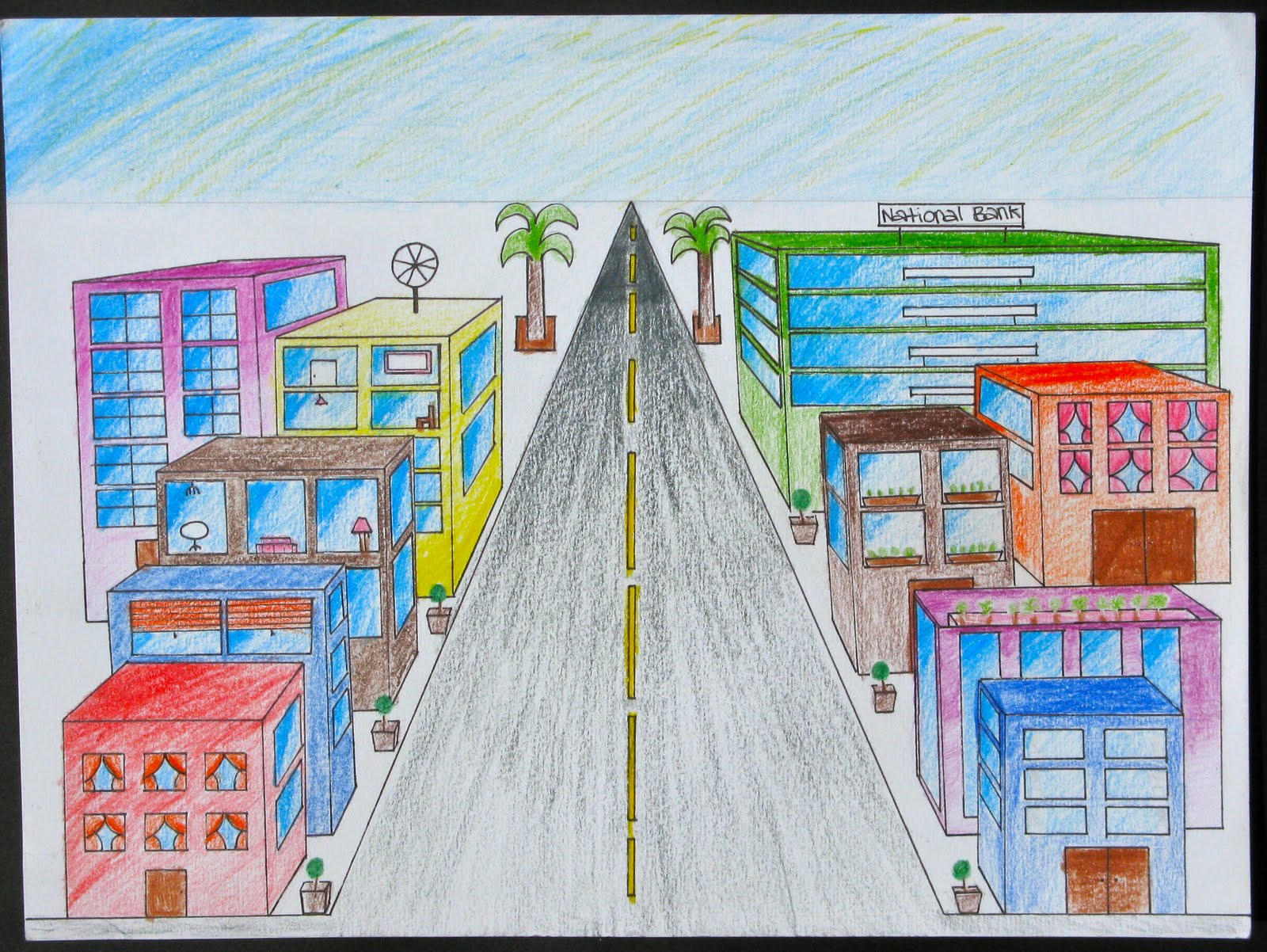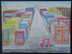The second option my 9th graders could choose involved our perspective unit. In class we practiced 1-point perspective, drawing boxes and creating a room with different pieces of furniture. If students chose this option for the semester exam, they were required to show me that they remembered how to draw boxes using 1-point perspective, to create a street scene with at least 10 buildings (colored or shaded) and to reflect on what they learned about perspective this year. Apparently some of them must have learned something because this is how their street scenes turned out: