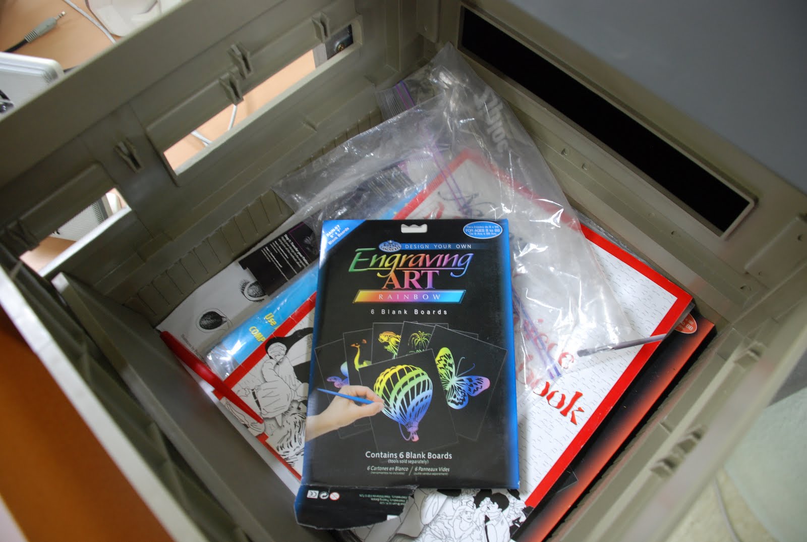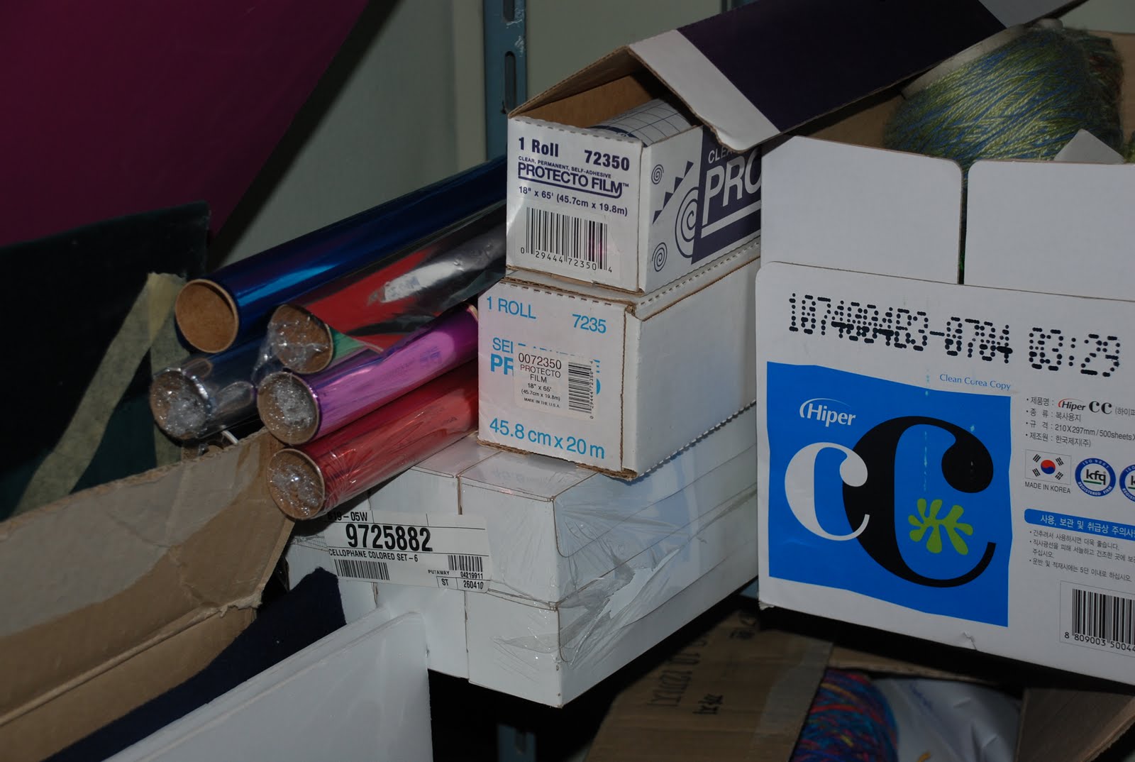 I’m getting the feeling that finding things in this art room is going to be a lot like participating in a year-long scavenger hunt. There are just so many shelves, cabinets, nooks and crannies that I can’t possibly go through everything and also find time to plan lessons, teach, and have a life. So I’ve been searching for one thing at a time. Today I wanted transparent contact paper. I knew there had to be some around here because I had found the backing in one of the scrap bins. I did eventually find rolls of it inside a box on a shelf in the corner of the storage room,