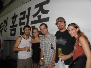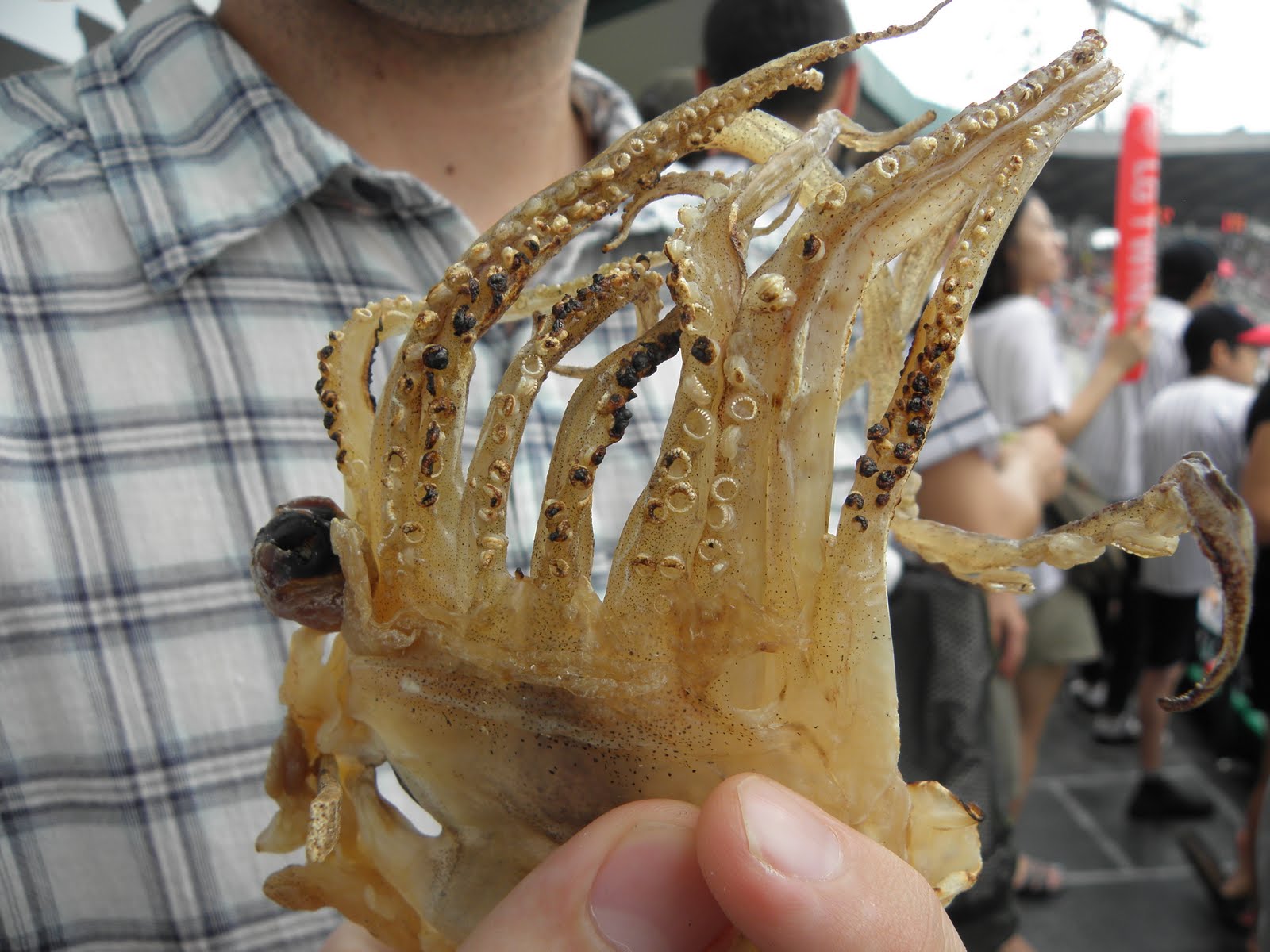 This weekend was a long weekend for Liberation Day. Which is the liberation of Korea from under Japan’s rule. So we figured what better way to celebrate then going to a baseball game. Very Korean right? In fact it wasn’t our idea so much as that of a couple of our coworkers and apparently a ton of Korean’s had the same idea. So while it had rained most of Sunday we figured we would still give it a go and the chance of rain dropped the later it got. We took the subway directly to the stadium as there is a station right outside of it and got out to the sound of the game under way and a bunch of food and beer vendors. One of our coworkers informed us that we should by a few beers to take into the game. I was confused at first but apparently bringing beers in is the norm. So we stocked up on beer and began to walk towards the entrance. However before going in I felt I should try the traditional Korean snack of dried squid. This consists of exactly what it sounds like a whole squid dried and then heated up a little on a burner. I got the original which has no seasoning making it rather plain. It had the consistency of chewy beef jerky and didn’t taste that good, it wasn’t bad so much as there wasn’t much to it and since you had to chew each bite for about 5mins. we didn’t feel the need to finish it.