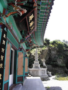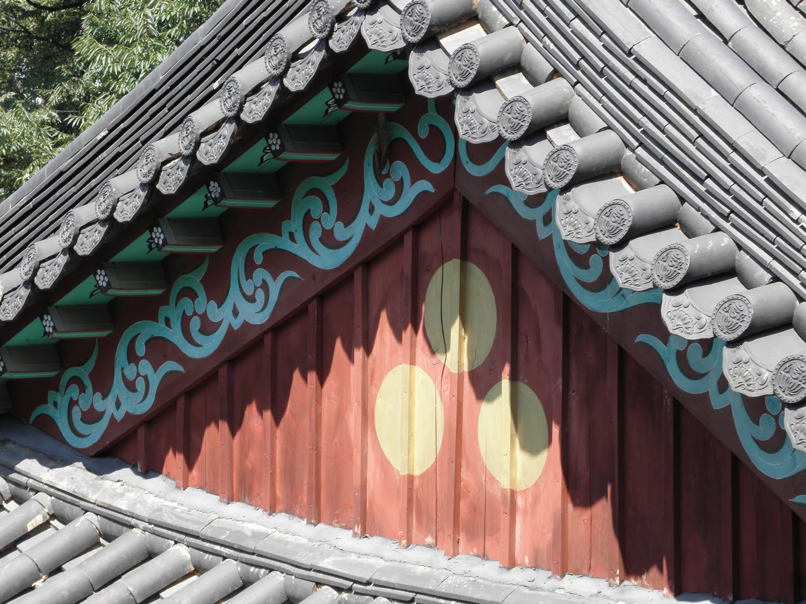 Three dots inside a circle. Katherine said she sees this on a lot of temples but is unsure of why they have it. After a little research online (take it for what its worth) apparently the faint outer circle and the three circles altogether represent the mind. Each inner circle represents something unique they are Buddha, Dharma, and Sangha. This is part of the Korean buddhist temples.