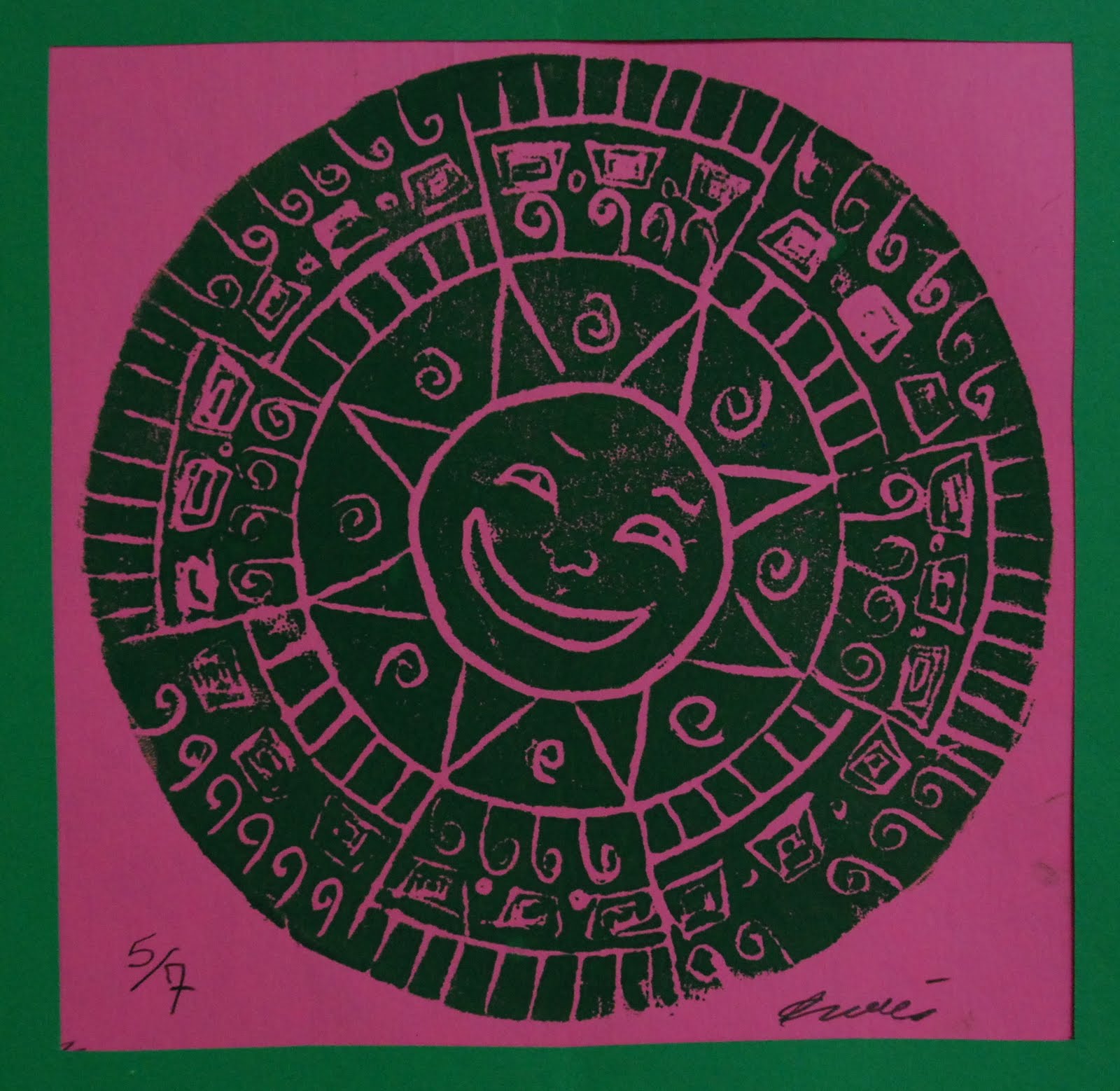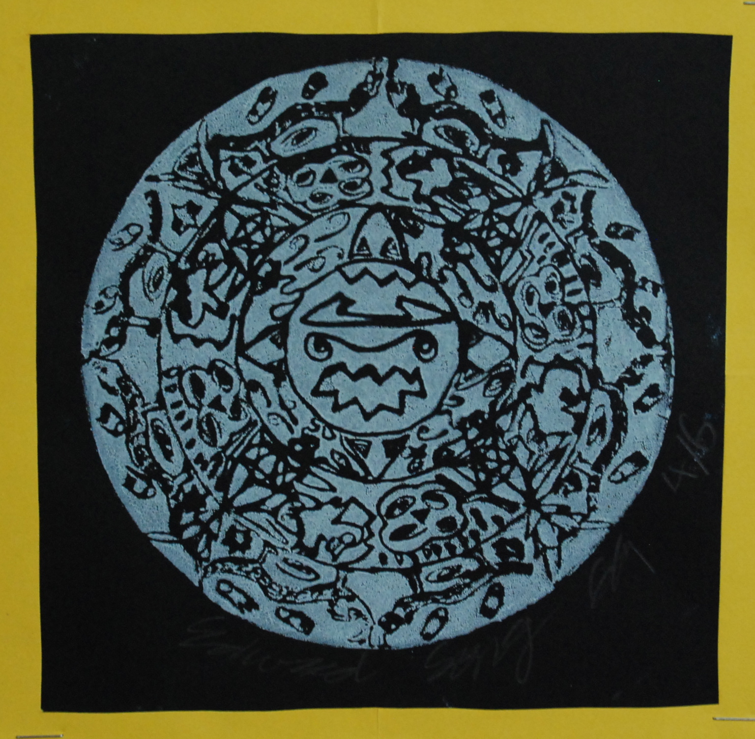 This Aztec Sun Stone project is one of my favorites! I taught it to 5th graders in Indiana and 7th graders in Honduras and now my 6th graders here in Korea have tried it out too. The students learned about the Aztec Sun Stone (they already knew a lot about the Aztec culture…yay!) and then designed their own radially symmetric design. After creating a foam printing block, they made lots of copies of their Sun Stone on fun colored paper.