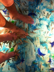 After a long day of wandering through Angkor temples, these cleaner fish did a great job of nibbling all the dirt off of our toes!