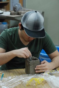 The students started by rolling out slabs, allowing them to get leatherhard, adding 3-D aspects, and carving textures. Then the kids started assembling everything…and that’s where things have gotten a bit hairy. Similar to our coil pot unit, the extreme perfectionist personalities of my students can sometimes lead to tragedy. Carving intricate details onto a flat slab is wonderful, but not if you let it get too dry before assembling all your walls, especially when you need to be able to cut through the walls to create a lid!