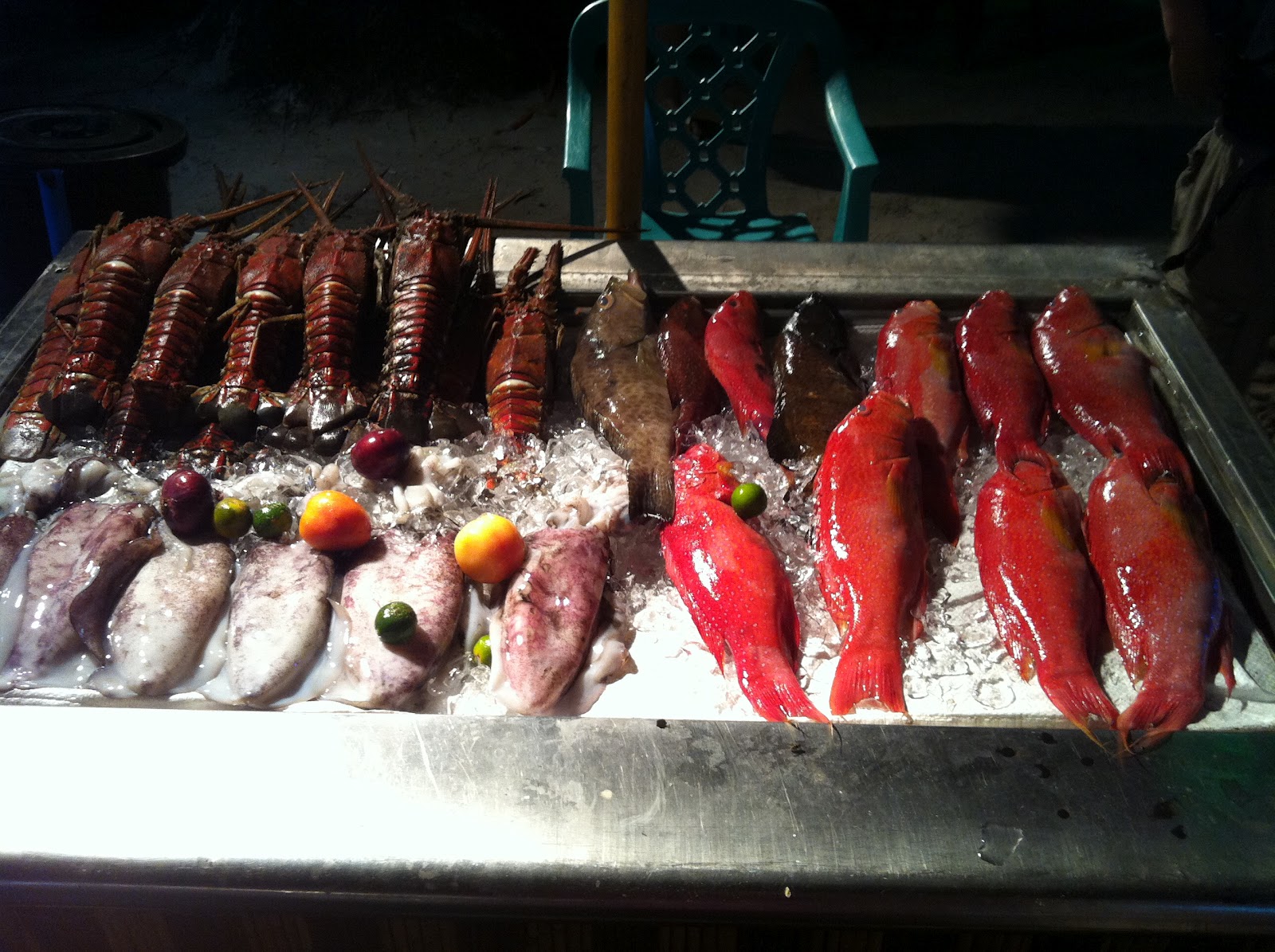 Dinner at one of the beach restaurants. We chose a lobster and a snapper to be grilled up.