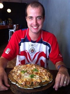 Me with a Frutti di Mar pizza. The crust was made with Octopus ink.