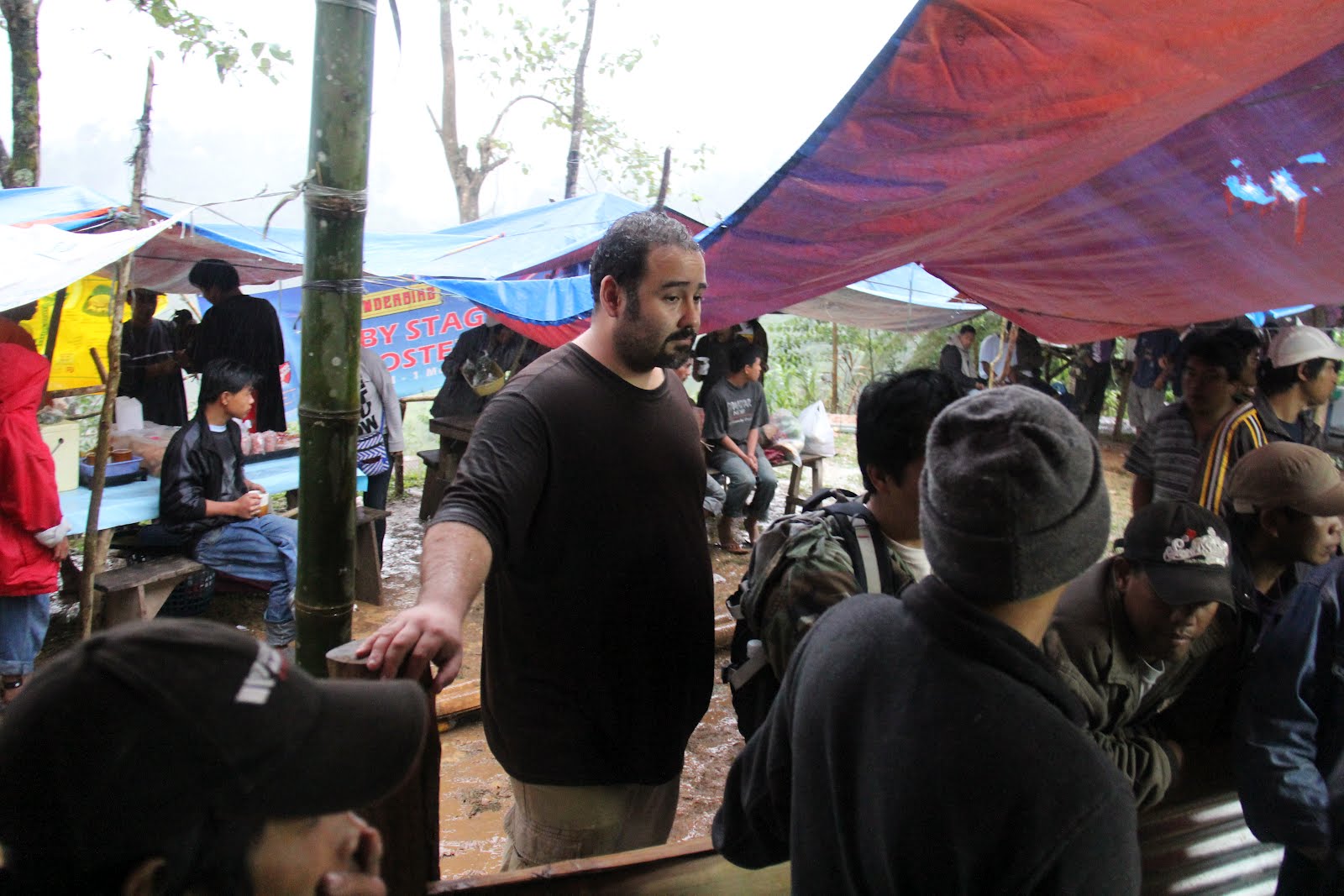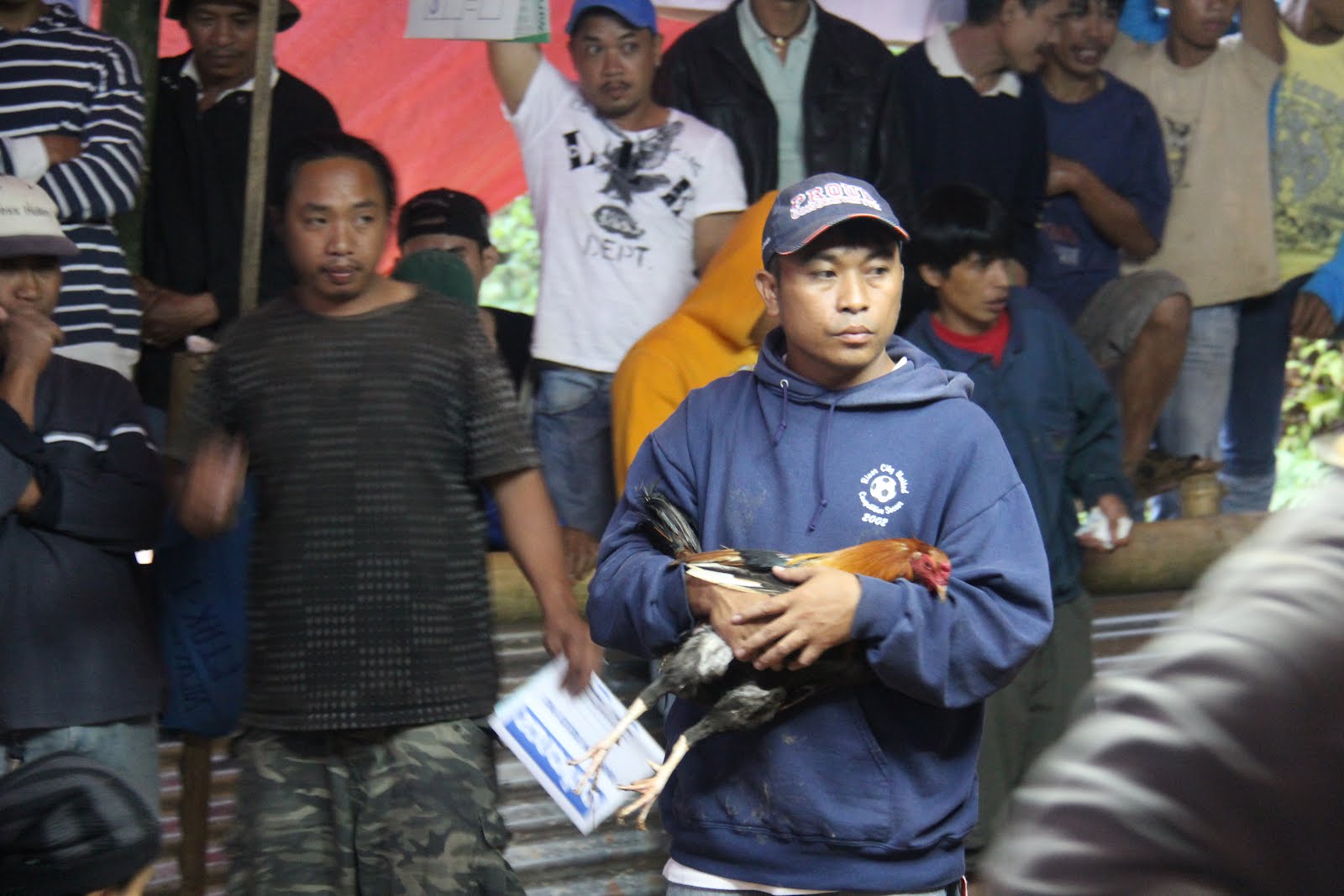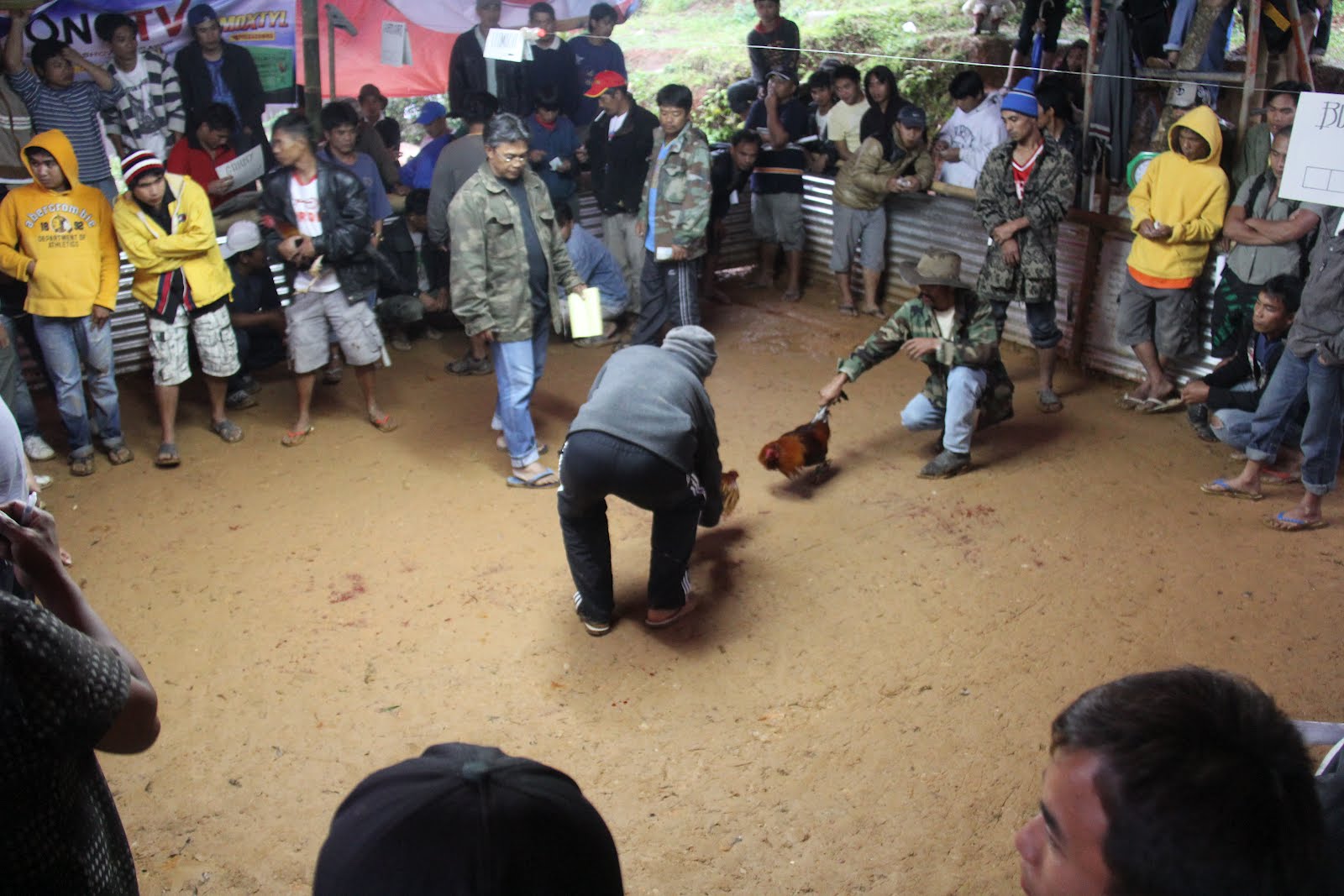 After checking into our hotel the first night and doing a little sight seeing which wasn’t very successful the first day due to the low clouds we thought we would relax back at the hotel after getting into some dry clothes. As we got our things out of the car we noticed some yelling and cheering coming from a nearby tarp. We asked a couple of the Jeepney drivers what was going on and were informed that it was the Sunday Cock Fights.  We (Daniel and I) figured we might as well go take a look. I’ve never been to a cock fight and I thought why not try it out in the Philippines where it is legal.