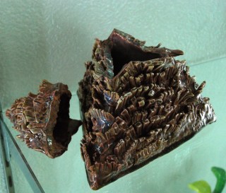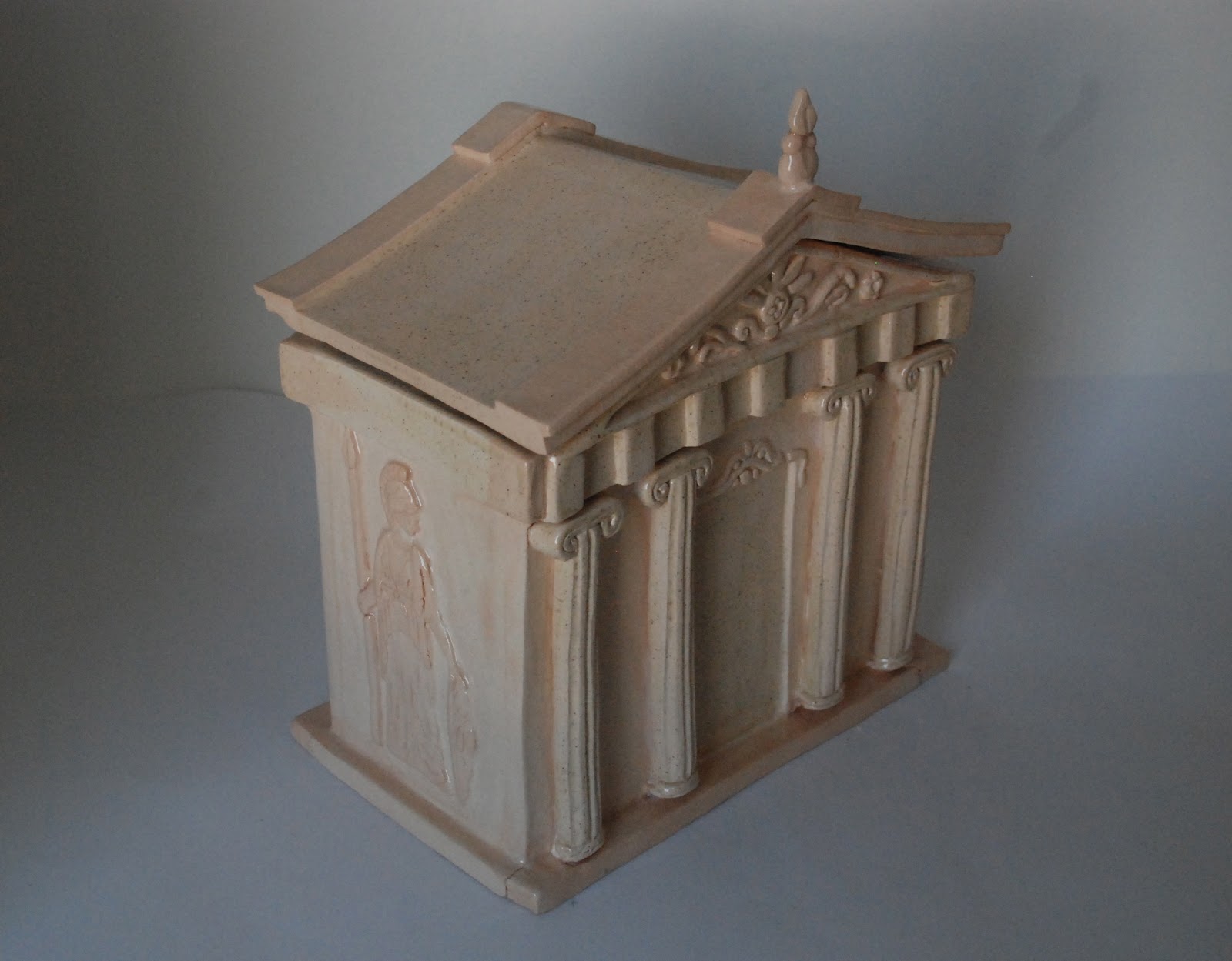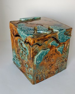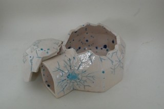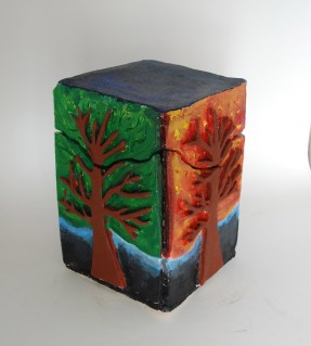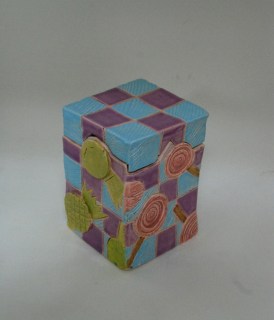 My high school students started these slab pots back in January (seriously) and are just now finishing them up (we put off glazing while working on another project). They were required to have a puzzle lid and include both additive and subtractive texture. I haven’t had a chance to take pictures of all of them, but here’s a sampler: