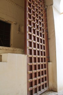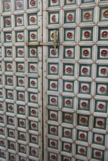 | We saw a variety of doors like this at palaces and forts around Rajasthan. The spikes are intended to stop elephants from charging when the building is under attack. |