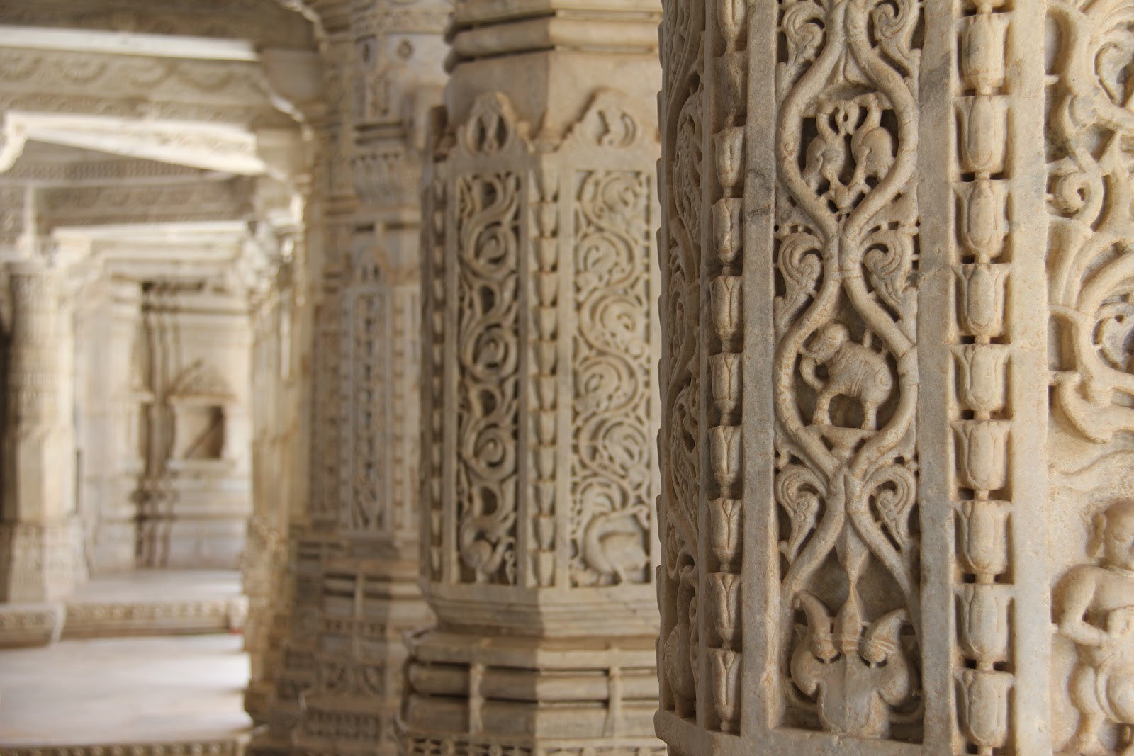 Following the fort we continued on our tour to Ranakpur Jain temple. What we had failed to plan for was that in order to enter a Jain temple we had to be more covered than we were. Caitlin was wearing a long skirt and I was wearing shorts. In both cases we were showing way too much shin to enter. So we had the option to rent pants and a muumuu. Caitlin got the muumuu and I got the pants, I don’t want your imagination to run wild. Prior to going in, all I could think is, this better be worth it, it was ridiculously hot with shorts on and throwing more layers wasn’t going to be pleasant. The situation got a little bit tougher when we had to take our shoes off once again prior to entering, which forced me to unceremoniously run up the stairs to avoid burning the soles of my feet.