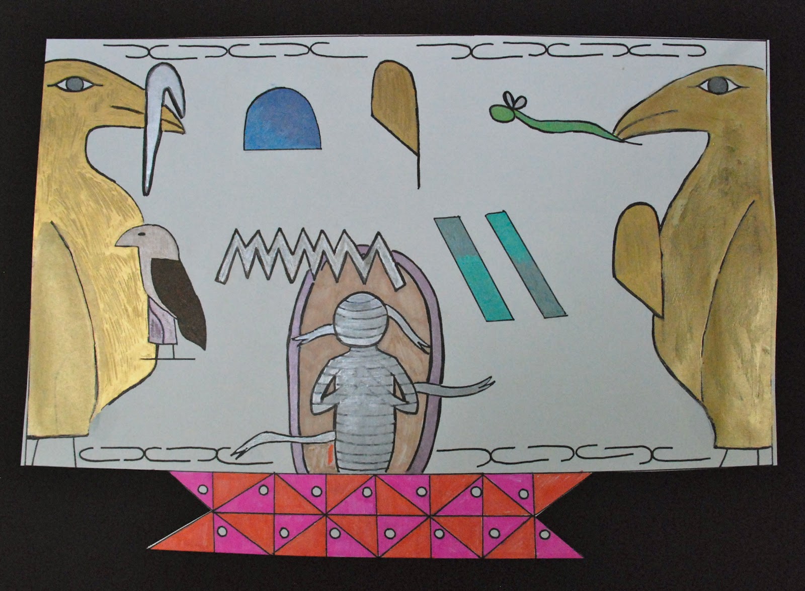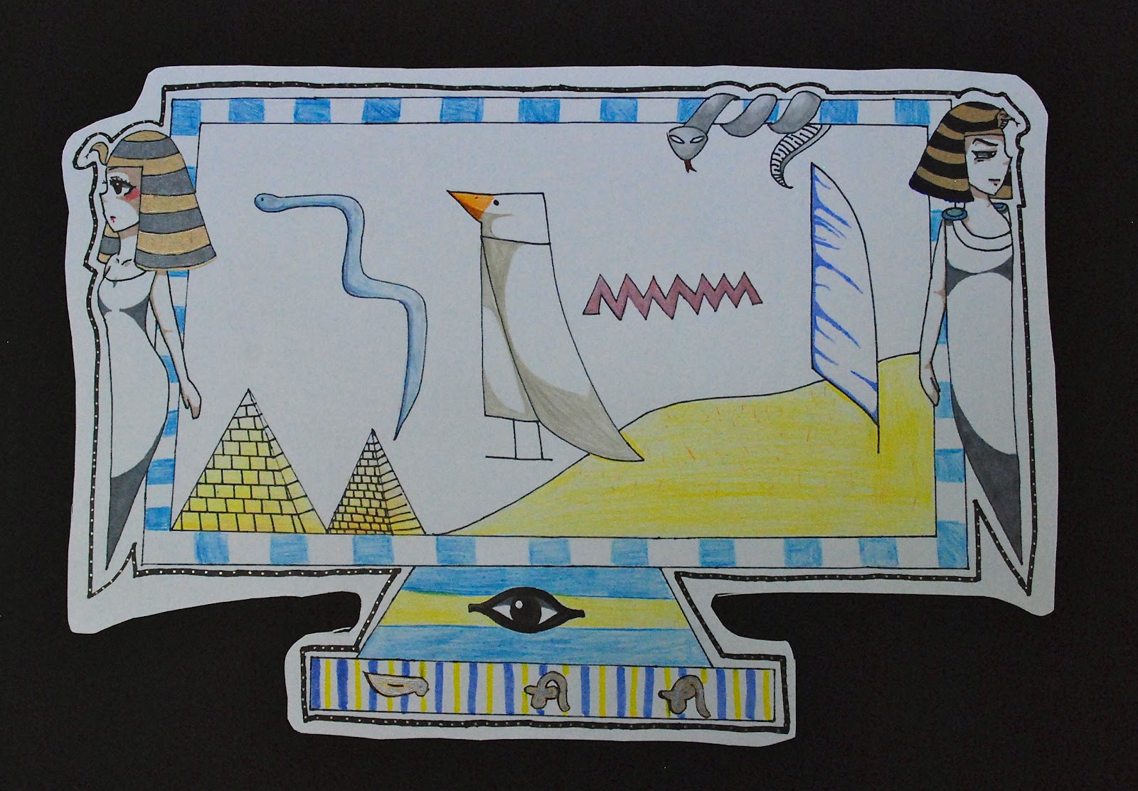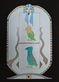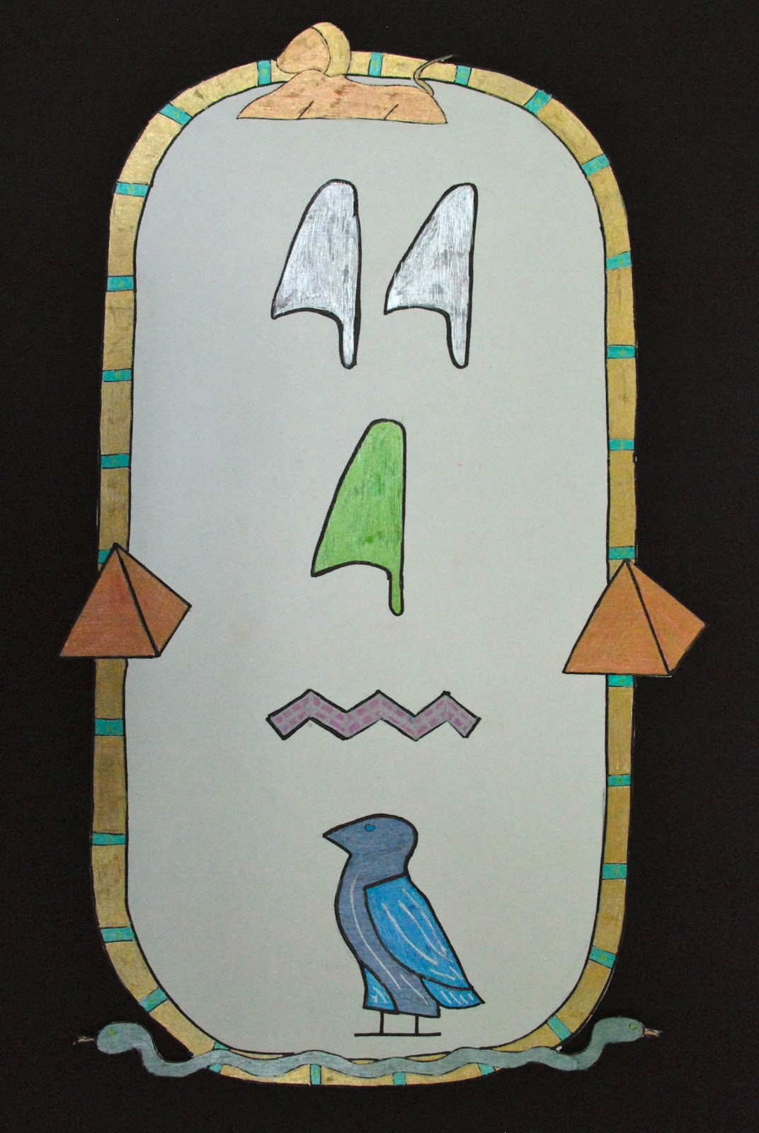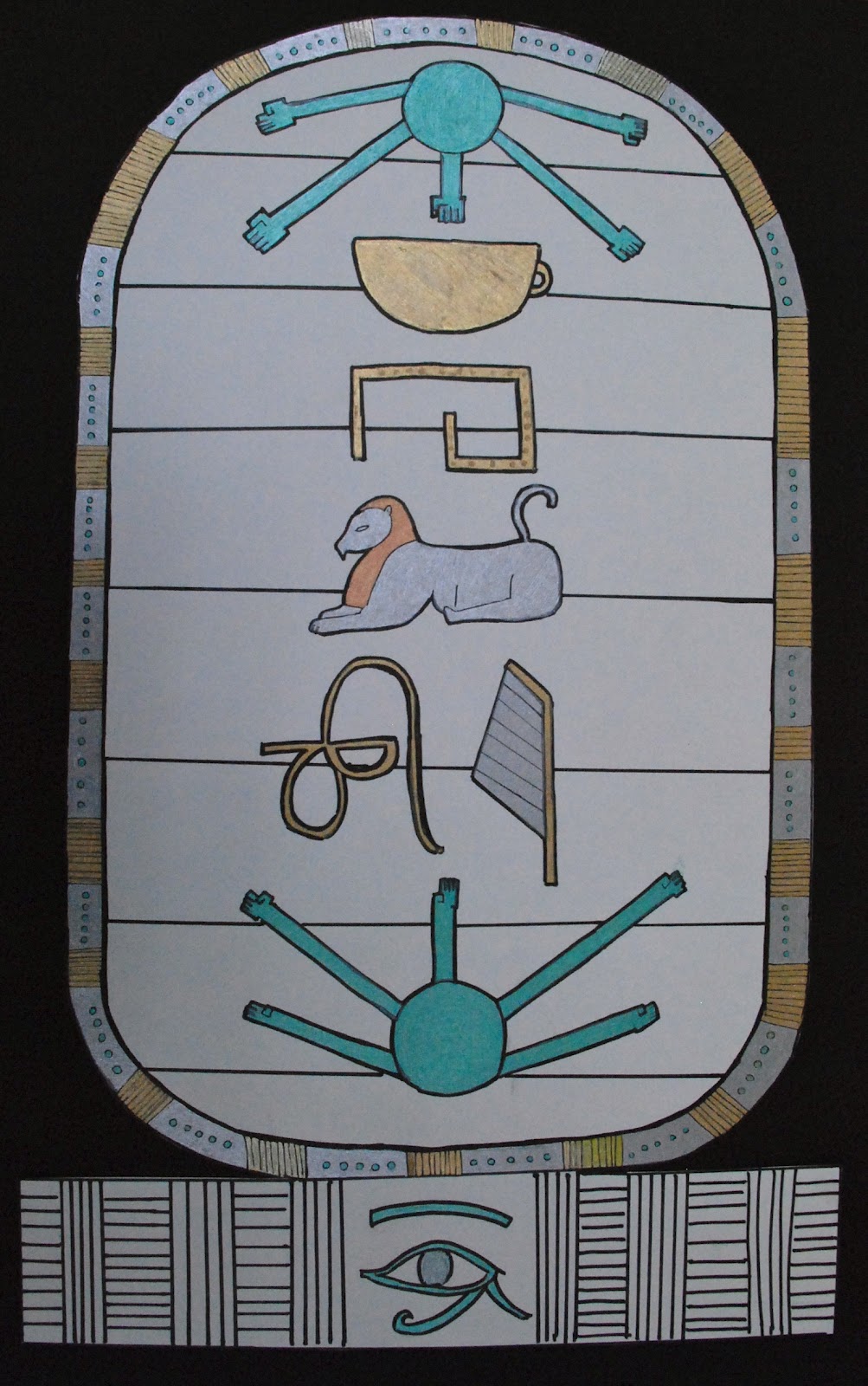 I gave a short presentation on Egyptian Hieroglyphs and what a “cartouche” is (basically a nameplate) and then gave each student an alphabet to decipher. They designed a nameplate using the hieroglyphs and then, after transferring the design to large paper, got down to work with the new gelly roll pens I ordered.