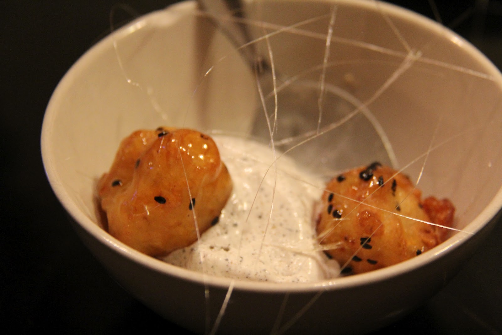 | As you can see the strings, they were cooled in our bowl by black sesame ice cream. I though this might be more gimmick than actual flavor but you could taste the black sesame in the ice cream more than you would expect. |