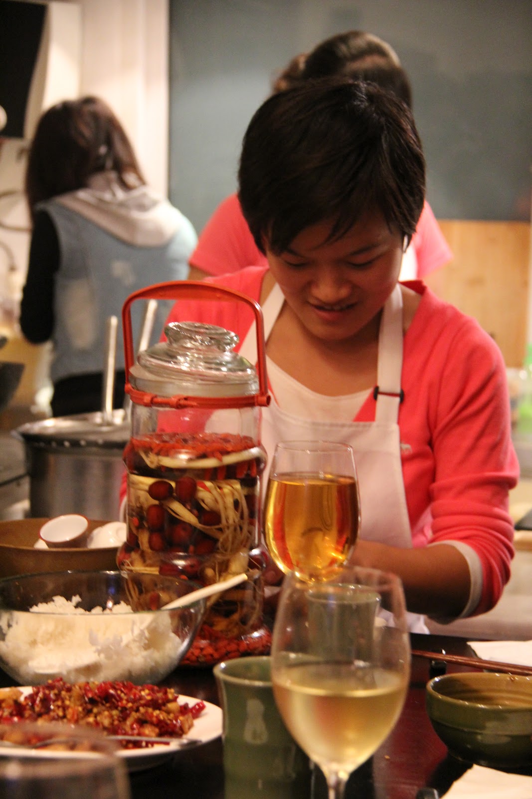 | One of the waitresses serving up the chinese alcohol. She said it is pretty strong stuff (think moonshine) but that they infuse it with different flavors to make it more flavorful. They served it with the spicy chicken so as not to overwhelm any of the other dishes. |