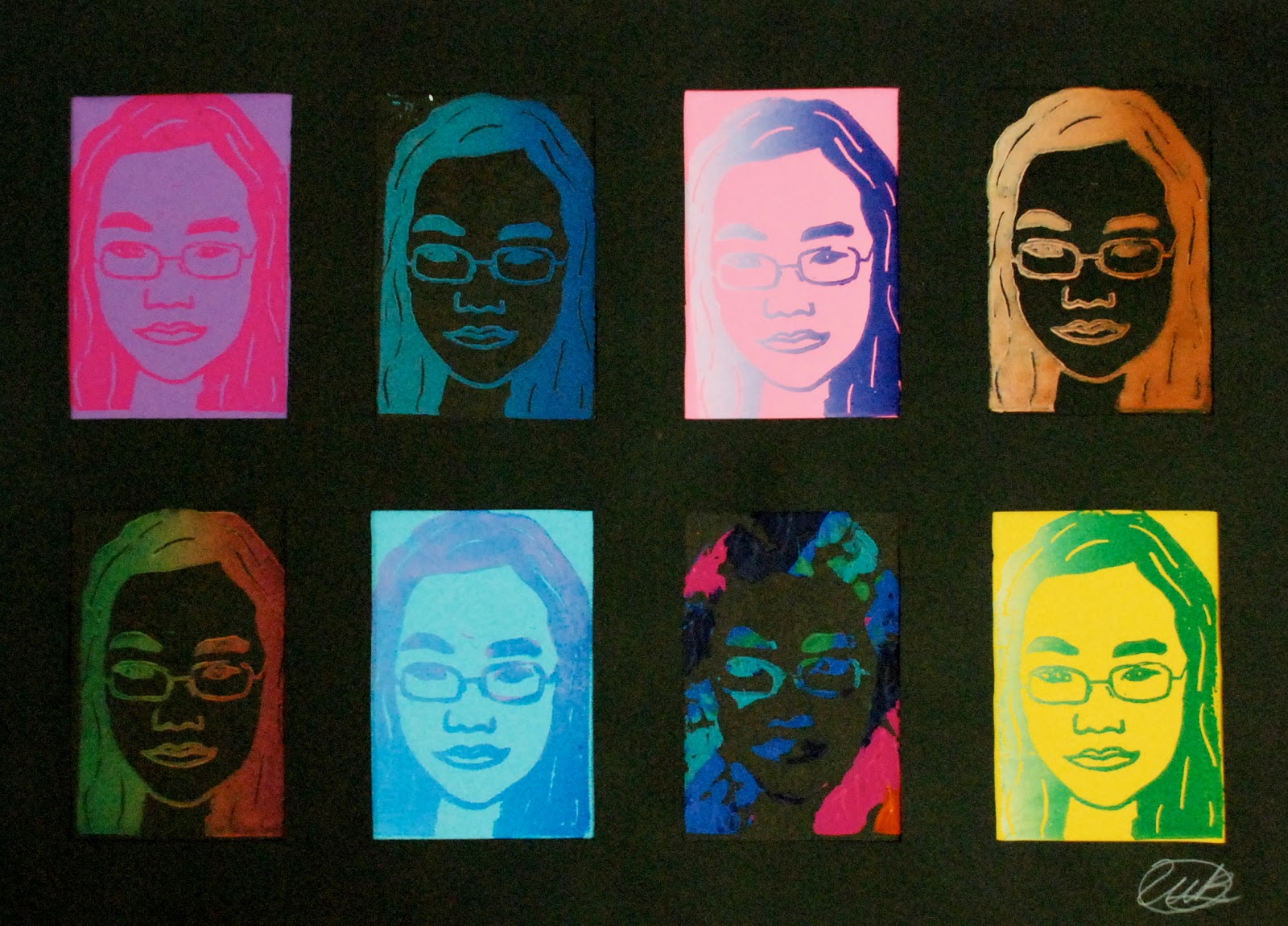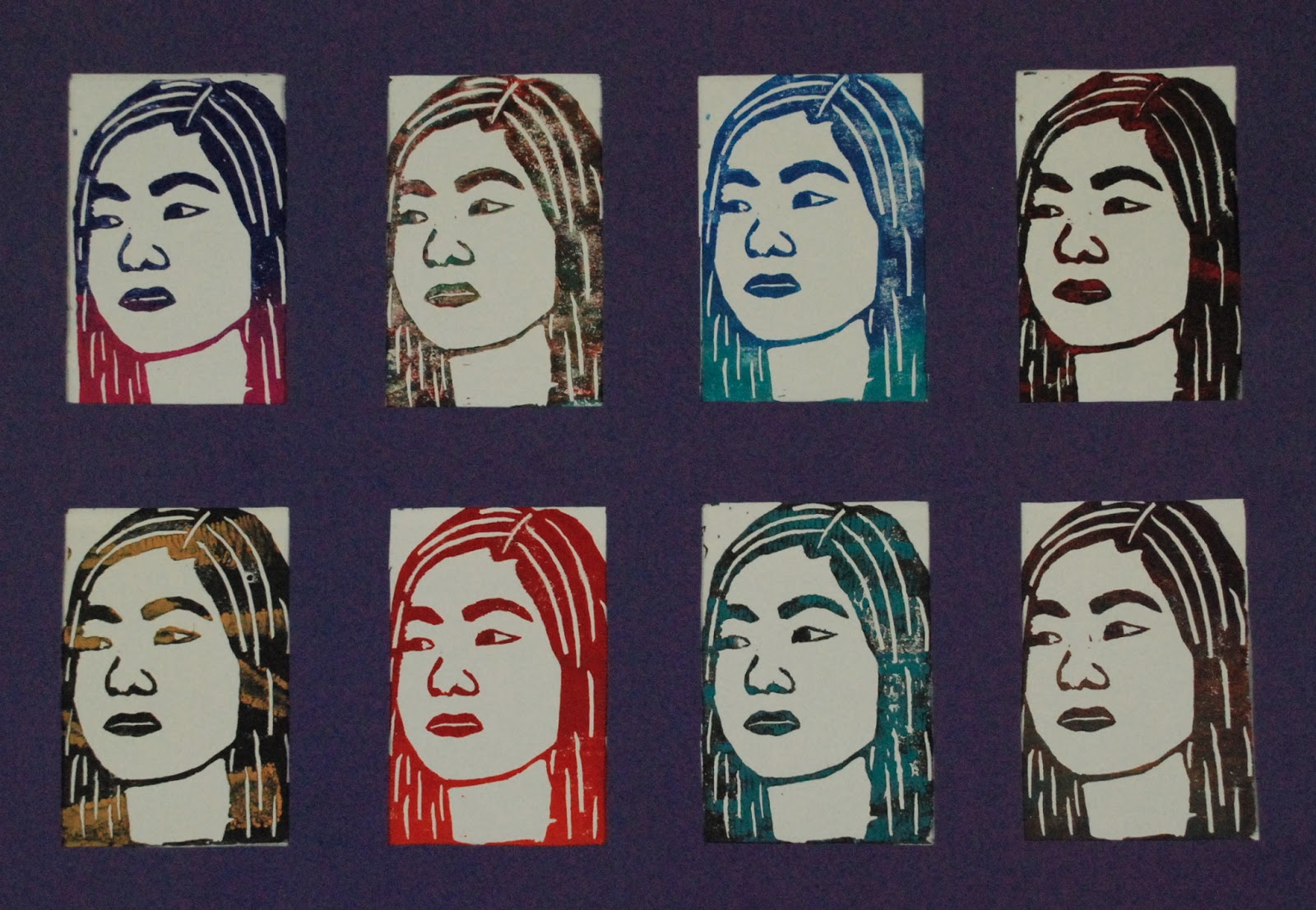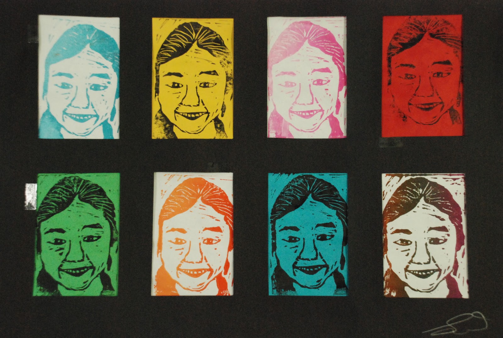 My 7th and 8th graders did a great job of carving a portrait of themselves into a piece of linoleum and printing all sorts of fun color combinations on colored paper. They made 8 piece frames to display several of their favorite prints a la Andy Warhol!