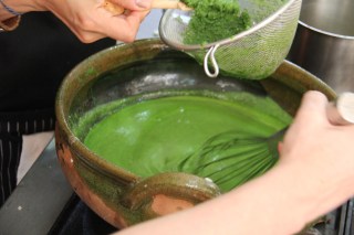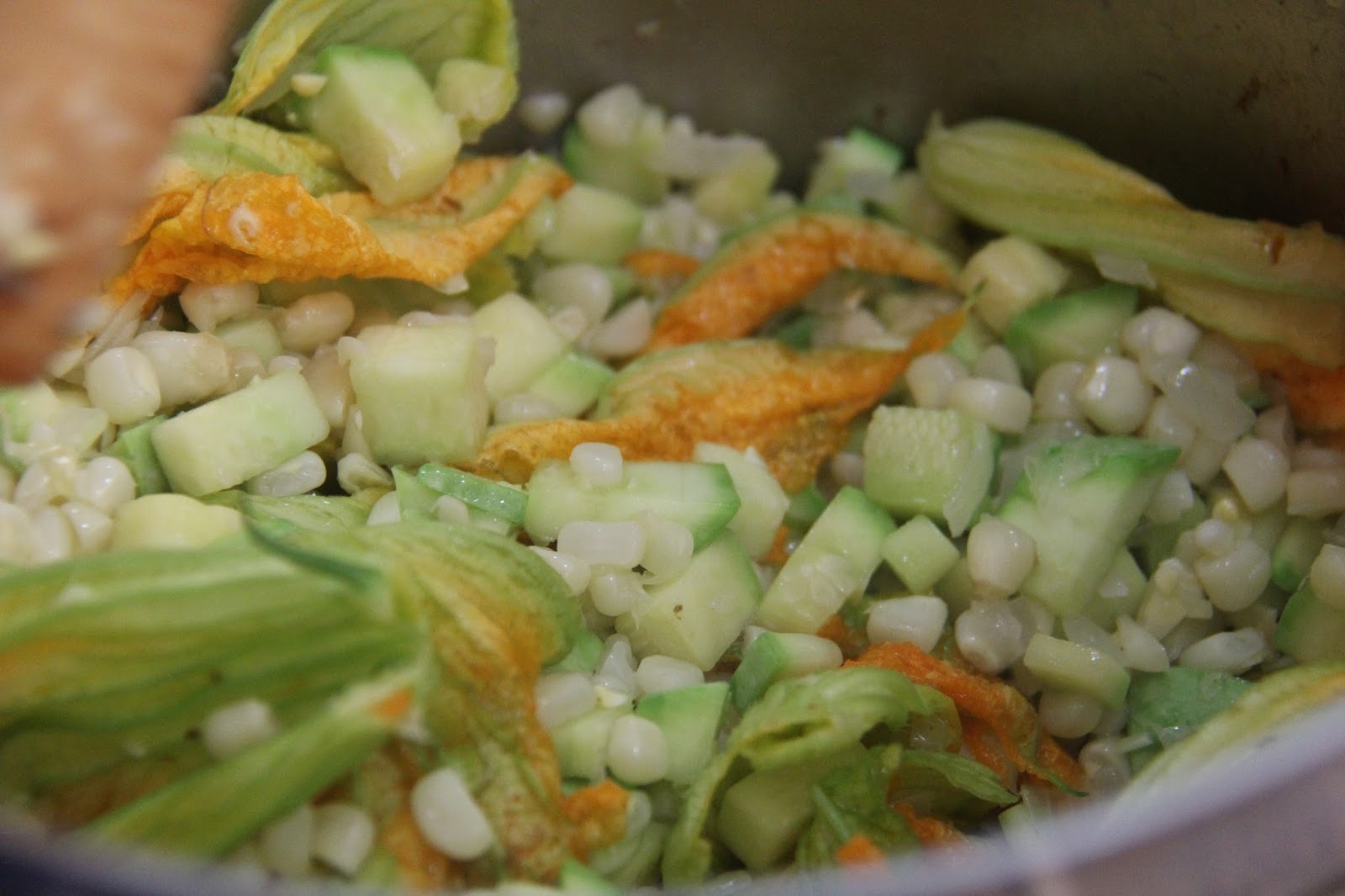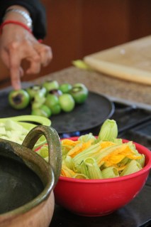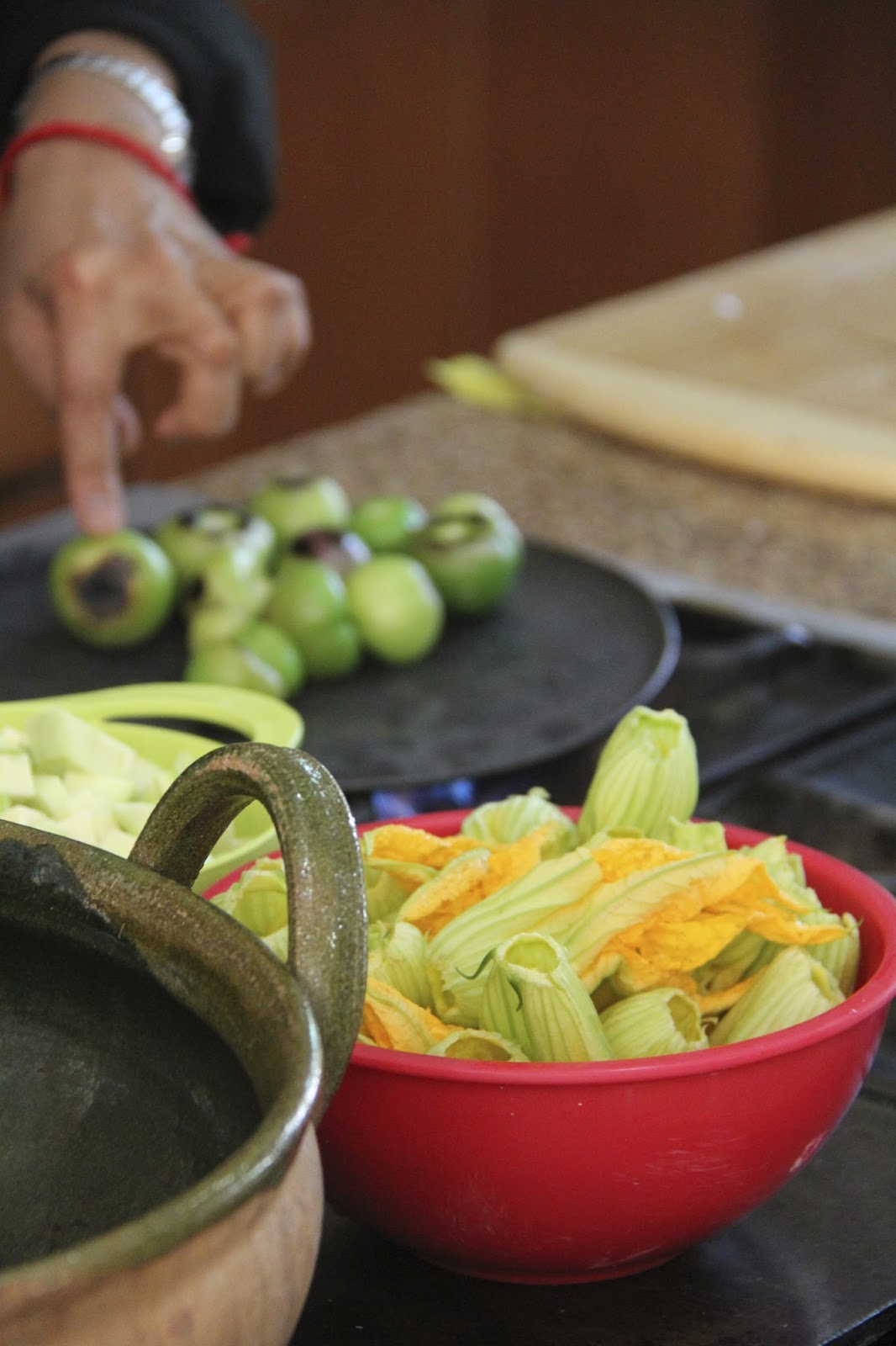 After collecting what we needed from the market we headed back to Pilar’s house and began making the dishes. The first dish was flor de calabaza soup, which was delicious and surprisingly she used no cream to thicken it. We then worked on the fillings for the memelitas which I’ve always called sopes. We used huitlacoche and mushrooms to make two different fillings. While working on making the soup and the filling we started making the homemade salsa in a molcajete. I had always wanted to try making salsa in one of these and now that I have I see why I will not be doing it very frequently. The amount of work necessary is ridiculous, but it definitely made a better salsa. The last dish we made was mole verde which unlike the mole verde I’ve had in other parts of Mexico did not have any pumpkin seeds in it. At the very end of the meal we made tortillas for the memelitas.