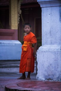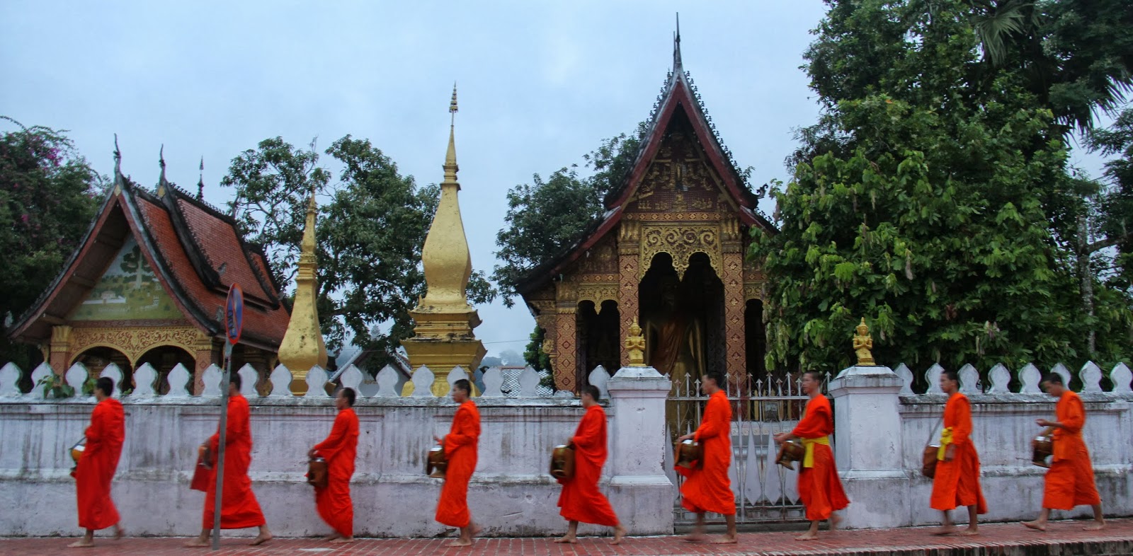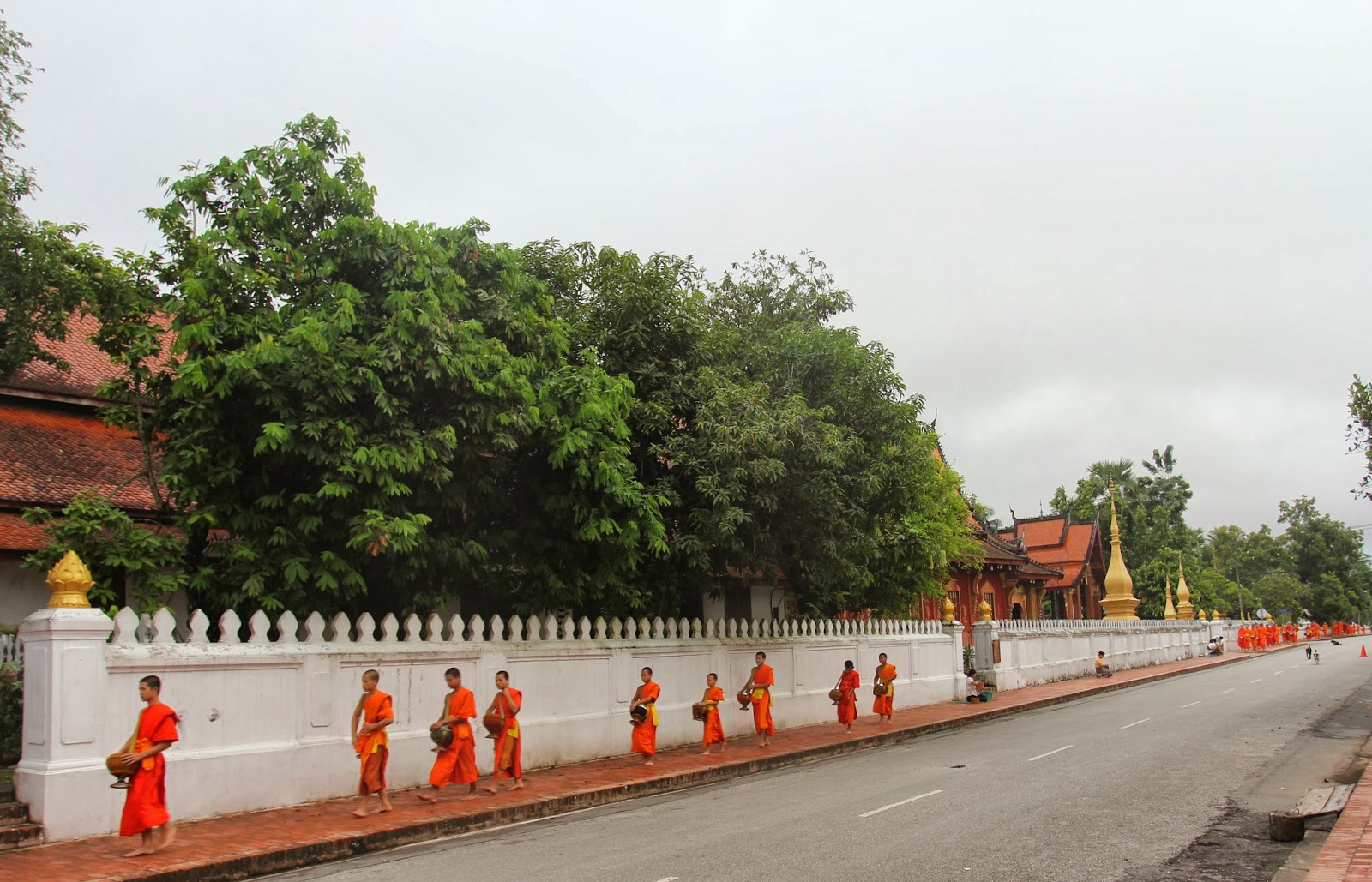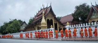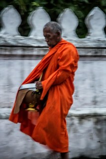 One of the things Luang Prabang is famous for is the monks collecting their alms in the morning. This consists of them walking a route with their beggar bowls collecting food for the day, they begin at sunrise. My understanding is that they are not to make eye contact and must walk in silence. One of the interesting parts of the ceremony is that they are trying to preserve it as religion rather than turn it into a tourist attraction. Making it difficult to rationalize seeing and taking pictures, realizing that I am part of the problem. I tried to be as unobtrusive as possible to minimize my presence. I could not resist taking pictures, I used my zoom and no flash in a compromise to myself. (This is just me justifying what I wanted to do). While we had see monks passing in Myanmar collecting alms we had never seen such a long line of monks going by. It was one of the cooler things we did in Luang Prabang.