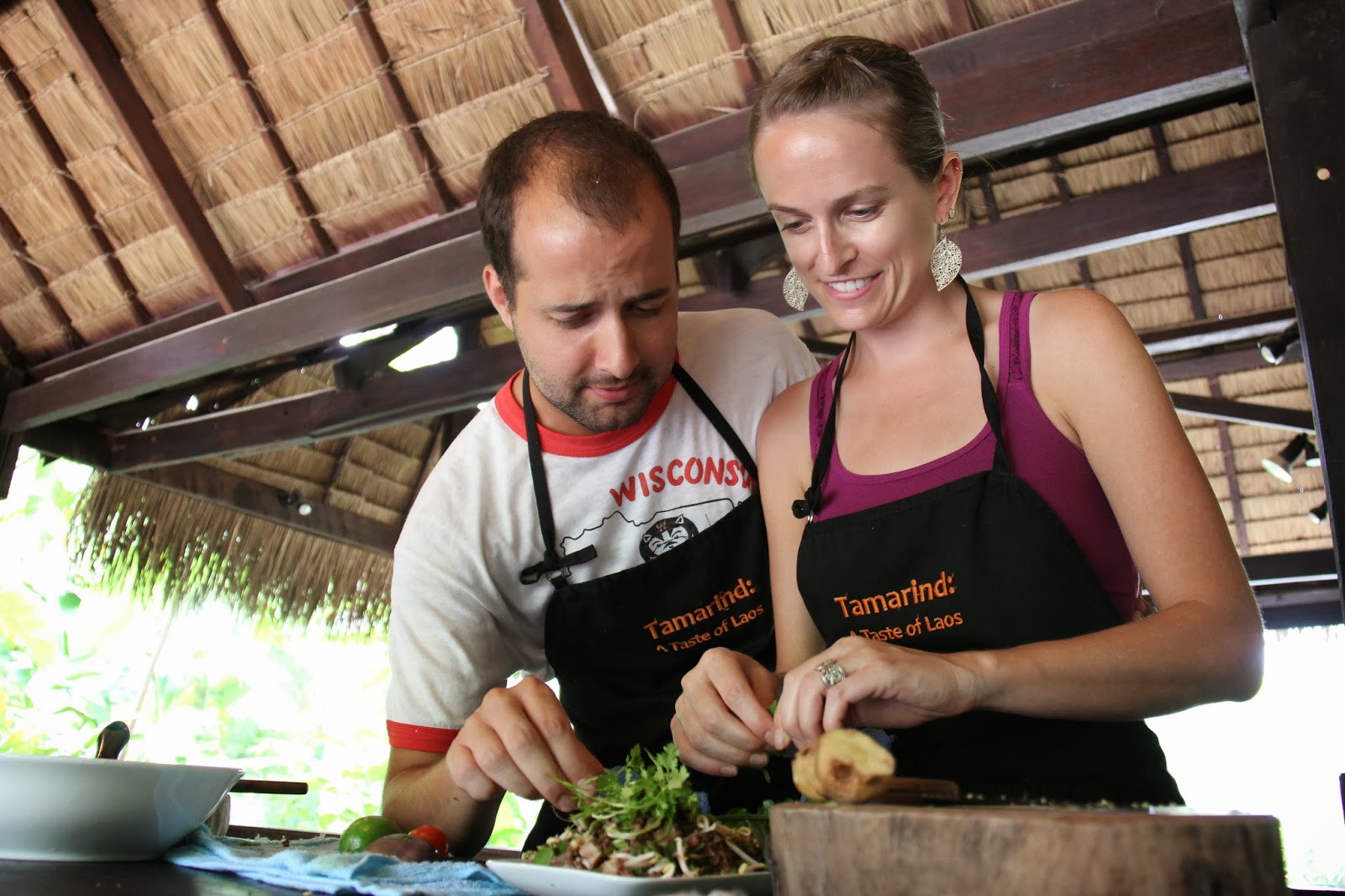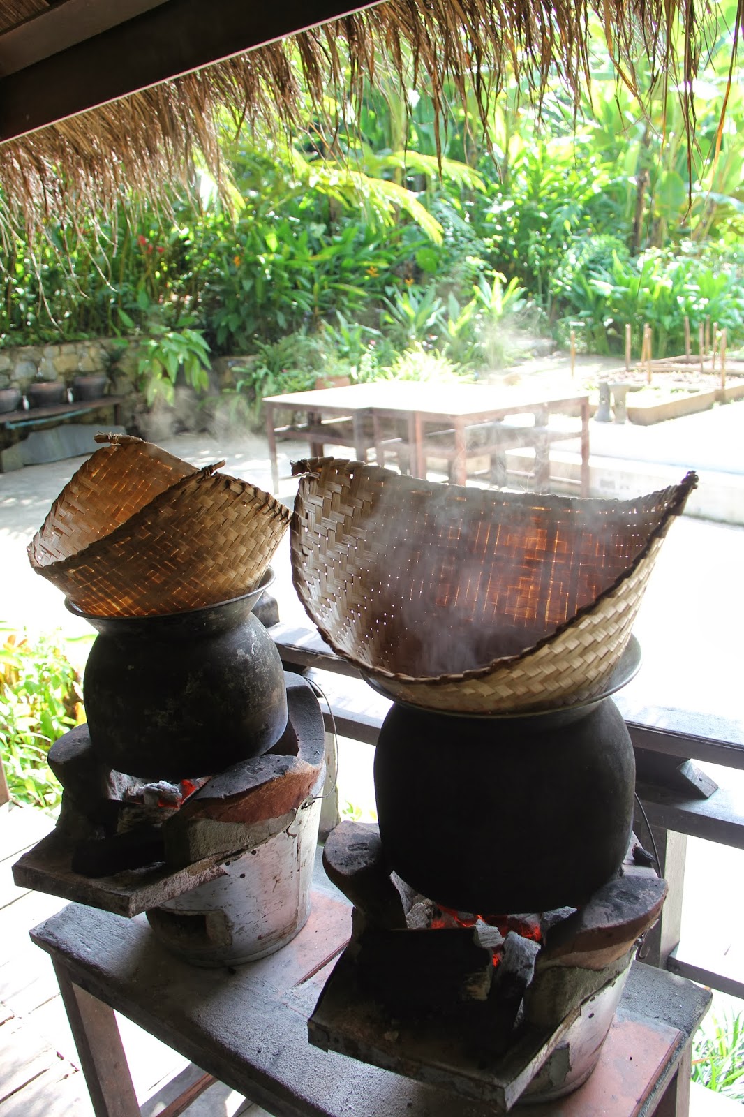 The class was located outside of Luang Prabang and was placed in an open air kitchen with beautiful, lush green scenery. The dishes we prepared were chicken stuffed in lemon grass, water buffalo lab and a fish cooked in a banana leaf(forgot the name). The chicken was stuffed into the center of the lemon grass stalk then dipped in egg and fried. The lemon grass along with a few spices provided the flavor. The water buffalo lab was seared and then cooked the rest of the way with lime juice, after which we added spices, long bean and bean sprouts. The fish I have completely forgotten aside from a few chiles. Lastly we had a sweet desert rice with coconut, and fruit.