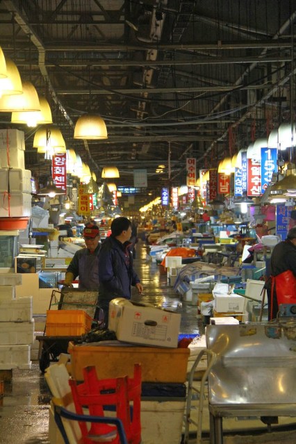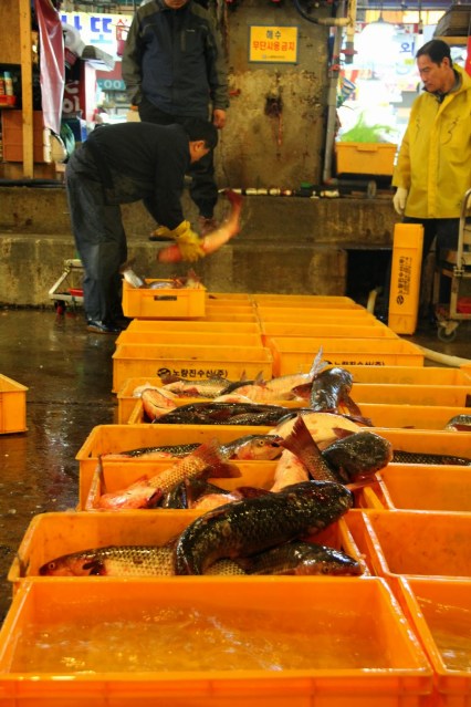 This morning I got up at 1:20am to go to the Noryangjin fish market. It had been on my list of things to do for sometime but I hadn’t gotten around to going nor had the motivation as 1:20am on a Saturday doesn’t sound appealing. Thankfully Mark was also keen on going and was up for a very early start to the day to go check it out, giving me the push to wake up. The reason why we wanted to go early was to catch the fish auction that starts at 3am. Noryangjin is the biggest seafood market in Seoul and serves as the selling point for other markets and restaurants.